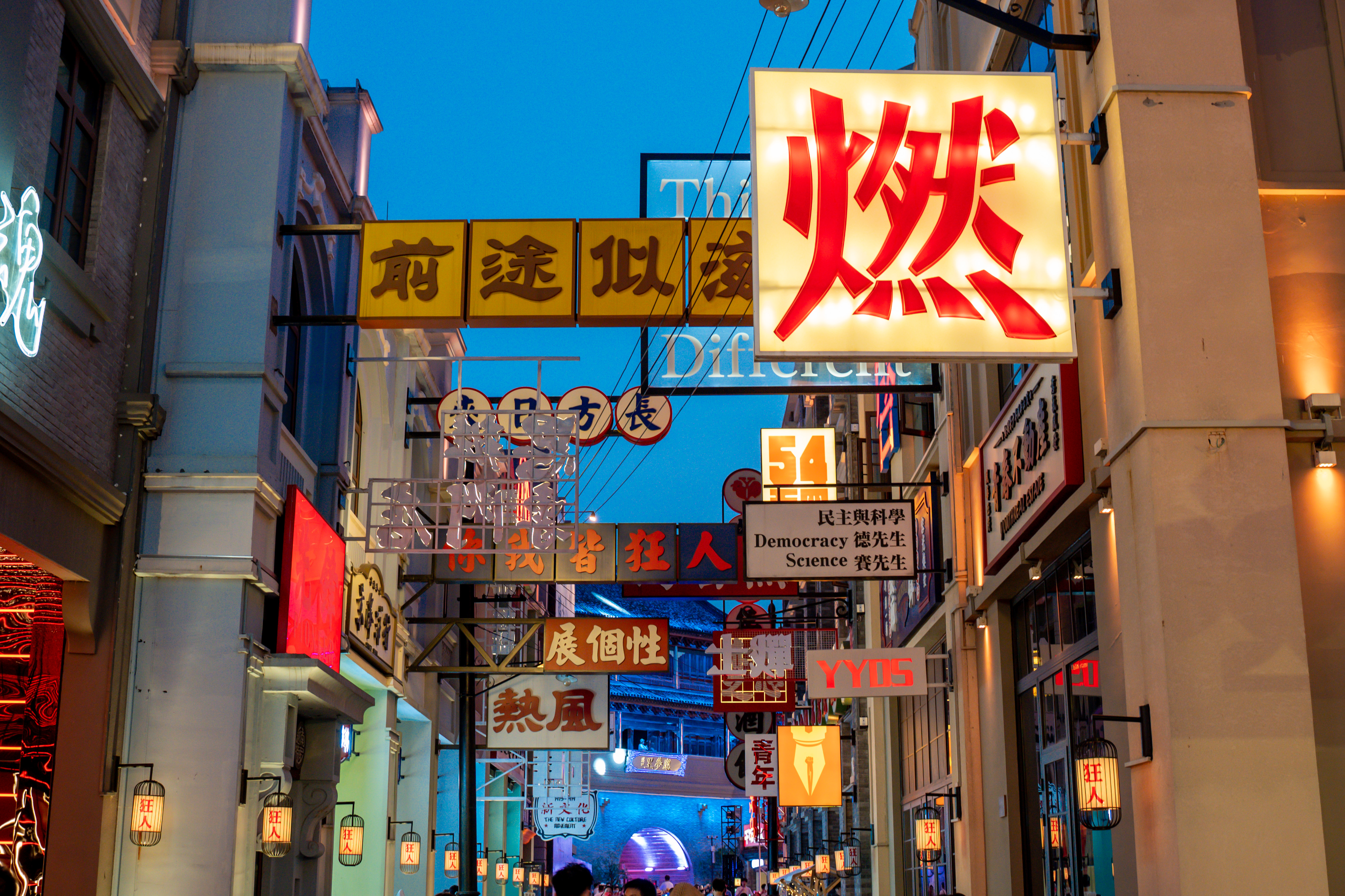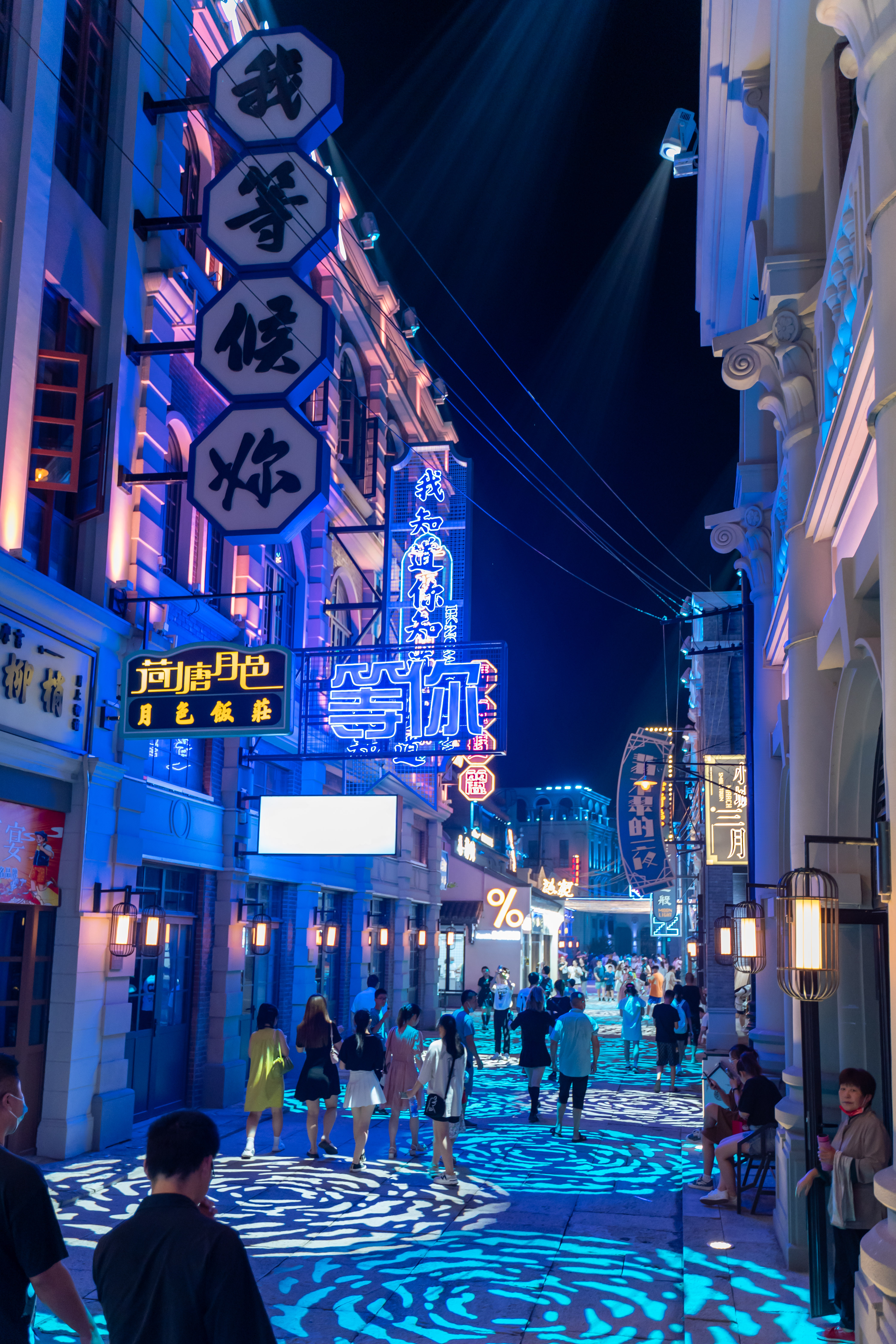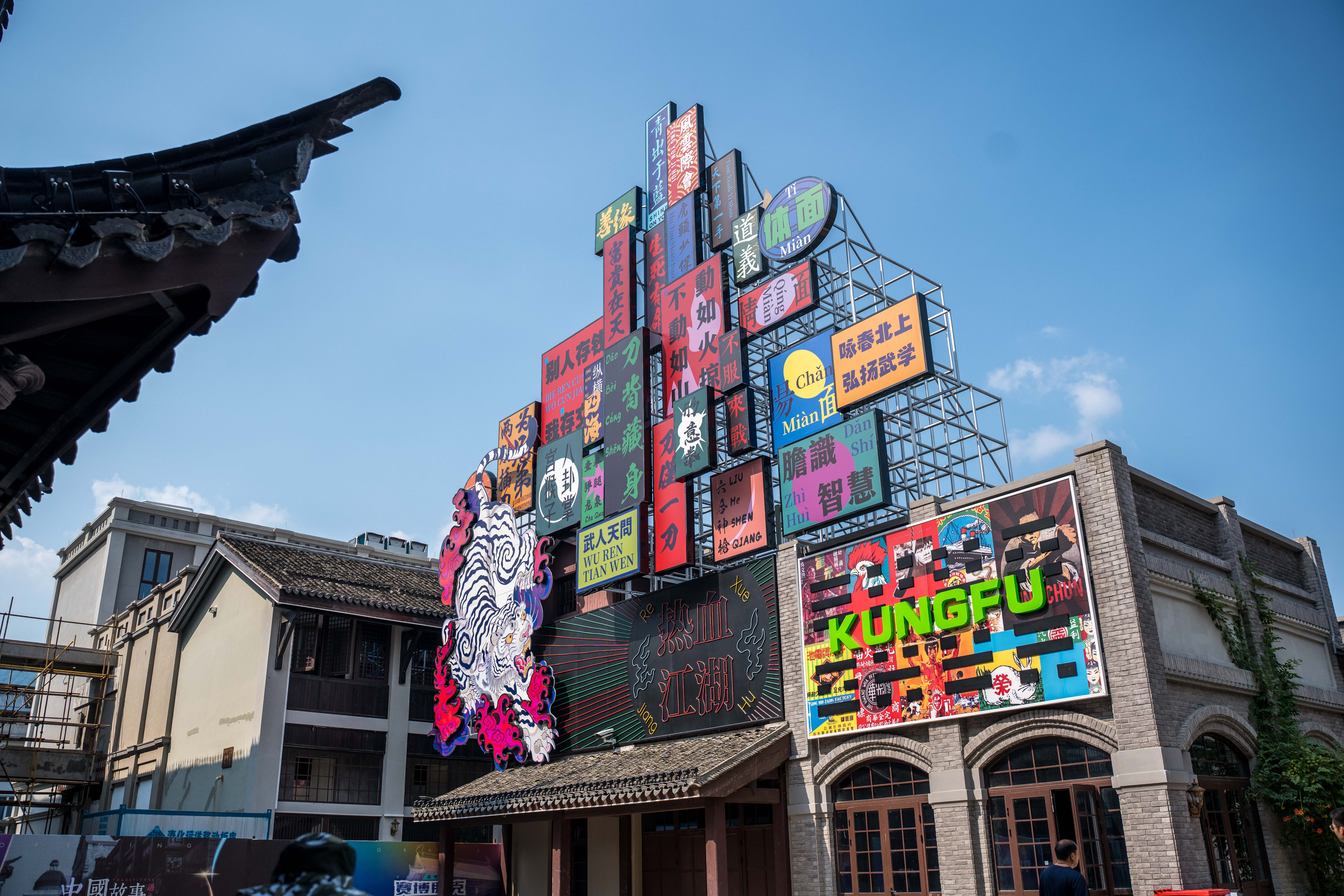 景区内包含狂人街、义勇坊、再康桥、江湖会、罗曼蒂克五大街区主题,狂人街两旁树立的招牌是众多游客打卡拍照的地方。