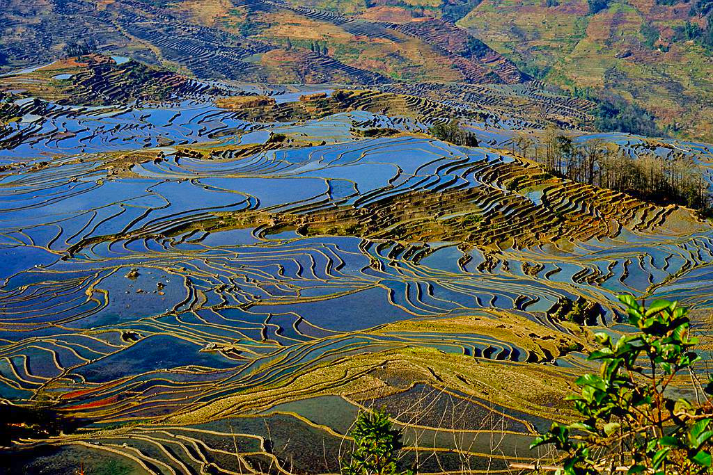 每到春天,除了赏春花之外,可以观赏一种景象----那就是梯田盈满水的景象。拍下了 元阳 梯田仿佛光影调色盘,简直美不胜收!而水天一色的蓝梯田,真是一幅神奇而美丽的画卷 !