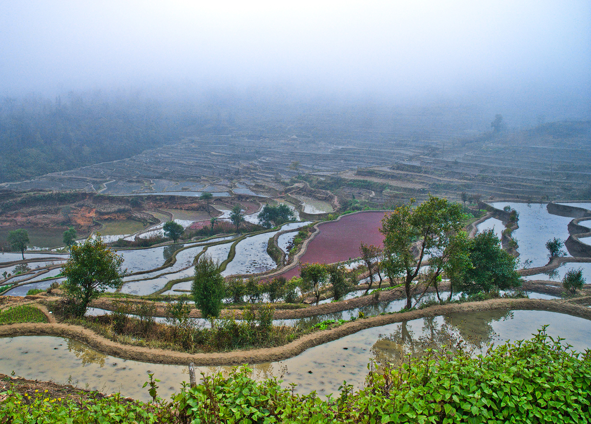 一年四季,梯田皆有其美。哈尼族人习惯在每年六月插秧,因此夏天的 元阳 ,到处是一片青葱稻浪。到了十月秋季,随着作物的丰收,山野也变为了金黄色,但看梯田最美的季节大概是春天,因为注水后的梯田会闪现出银白色的光芒,从而凸显出梯田的婀娜曲折的轮廓。我们正是在注水时节到此。