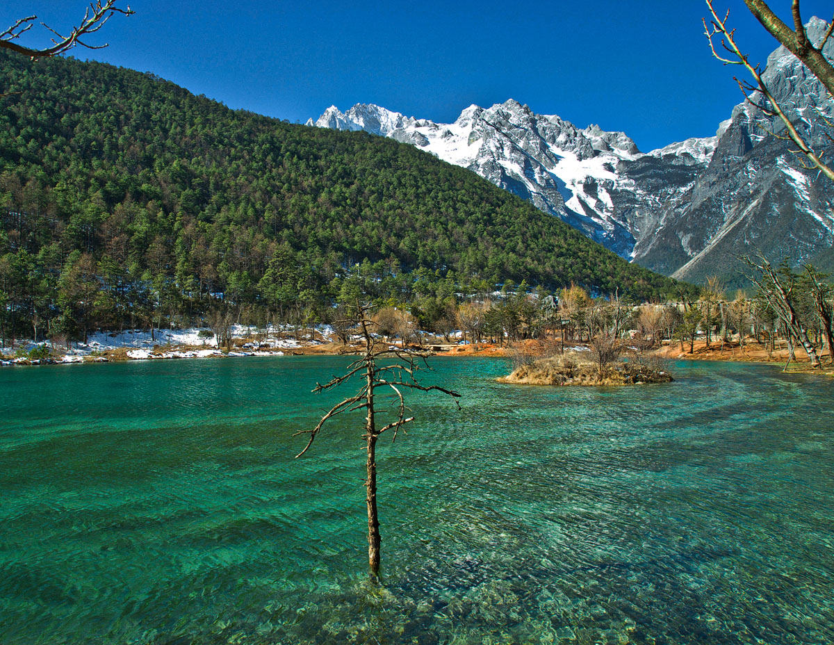 很想知道水中这棵枯树,在这里站了多少年?这个视角,是蓝月谷最美的一面了。这里雪山在上,湖水相连,小巧精致,湖和湖之间,有些隔断,有的是桥,有的是筑起的矮坝,也因此形成了不同的景致。那边一道矮坝,湖水淌下来,像个小瀑布