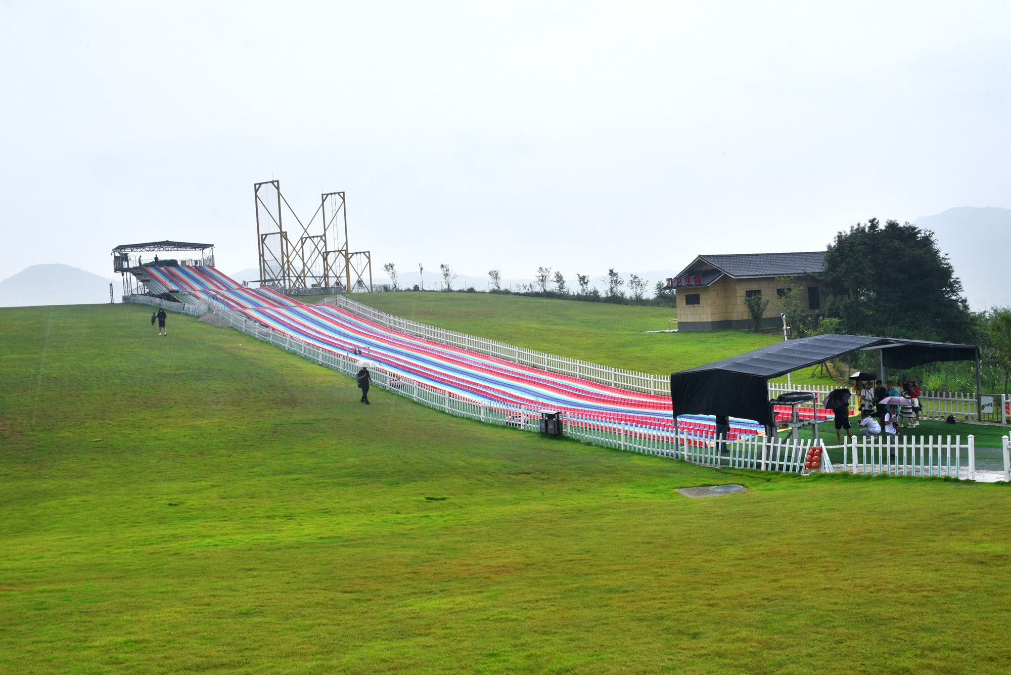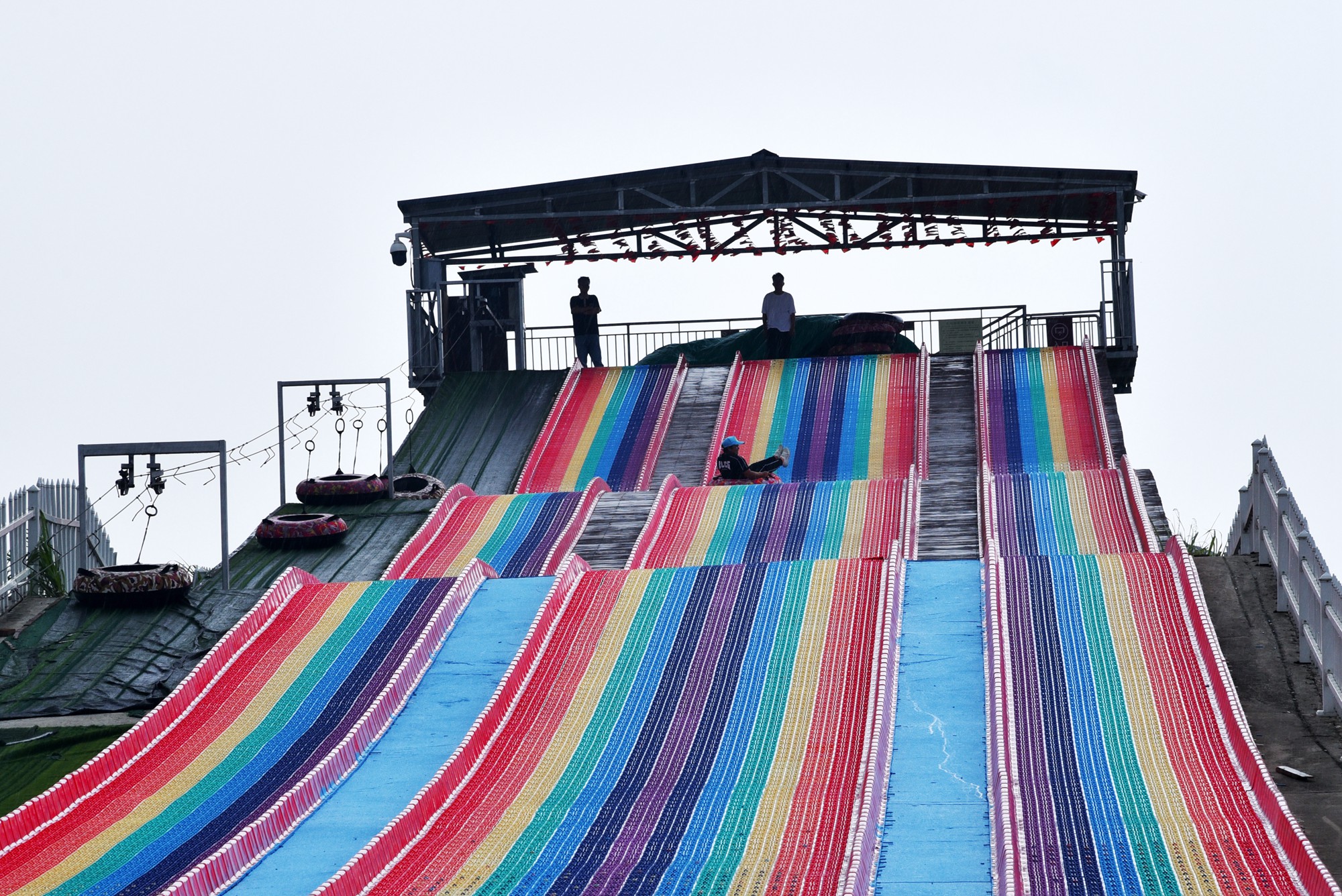 登上彩虹滑道,从高坡上滑行而下,过程中身体不能保持向前,而是转着下来,体重越大,速度越快,滑得也更远,乐趣也更多。