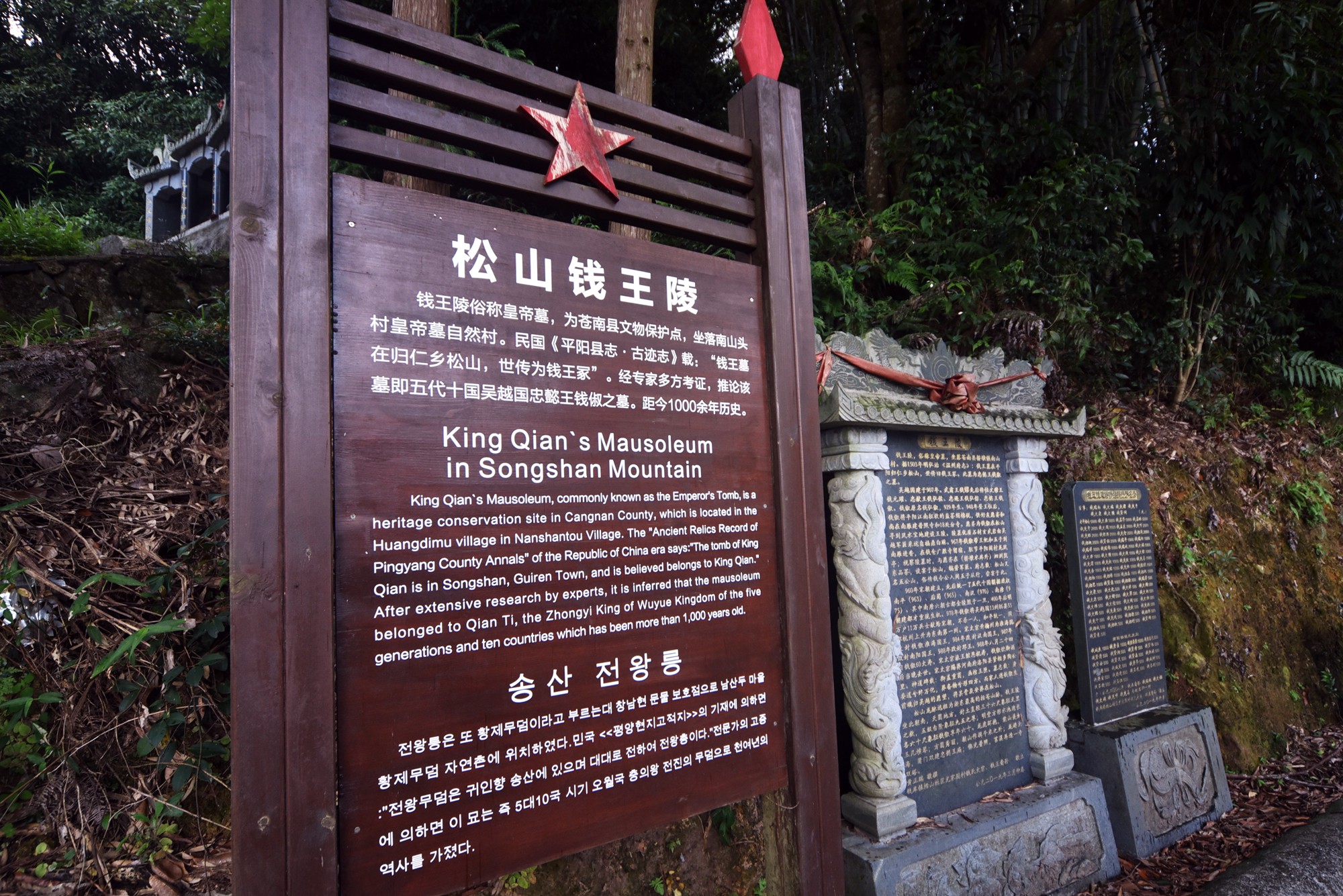 下车走过一条小路,绕过山坡转到山前,我们终于见到了这座神秘的帝王墓,半山坡上已经没有什么遗存,眼前看到的大多是后人增补上去的物件,还有钱氏族人供奉的记录。从地势上看,背有靠山,前面开阔,山水环绕,不失为一处风水佳境。钱王陵,当地人称作皇帝墓,现在是苍南县的一处文物保护点,也是南山头村重要的人文景点之一。民国时期的《平阳县志·古迹志》有记载:“钱王墓在归仁乡松山,世传为钱王冢”。后来经过专家考证,推测墓主人为吴越国忠懿王钱俶。