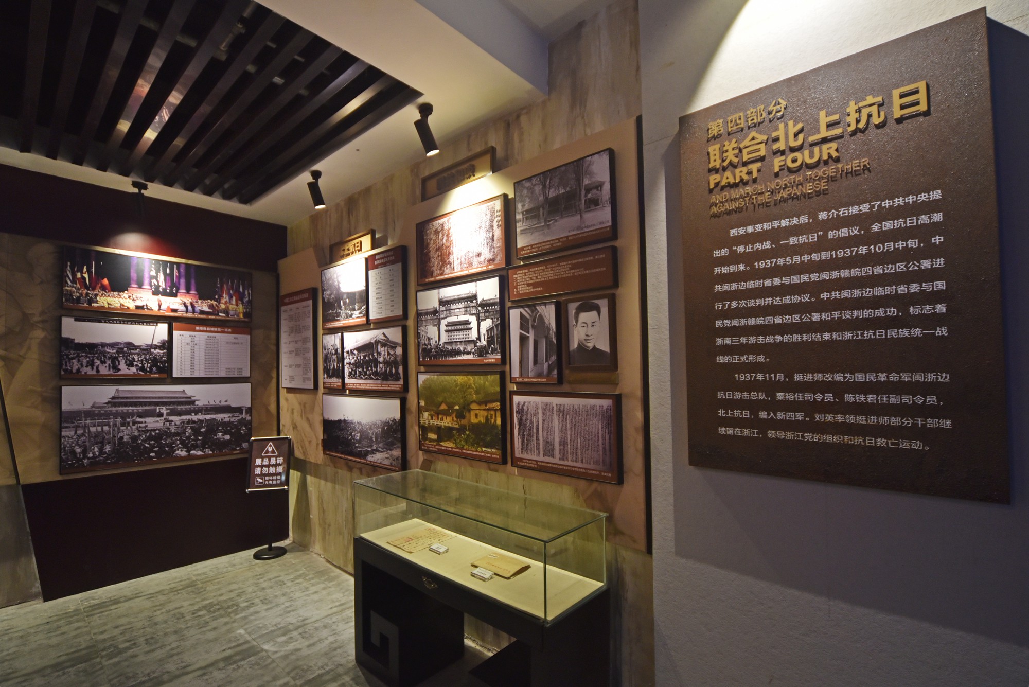 纪念馆的第四部分:联合北上抗日。卢沟桥事变后,抗日战争全面爆发,中共闽浙边临时省委与国民党闽浙赣皖四省边区公署谈判的成功,标志着浙南三年游击战争的结束和抗日民族统一战线的形成。1937年11月,挺进师改编为国民革命军闽浙边抗日游击总队,北上抗日,编入新四军。