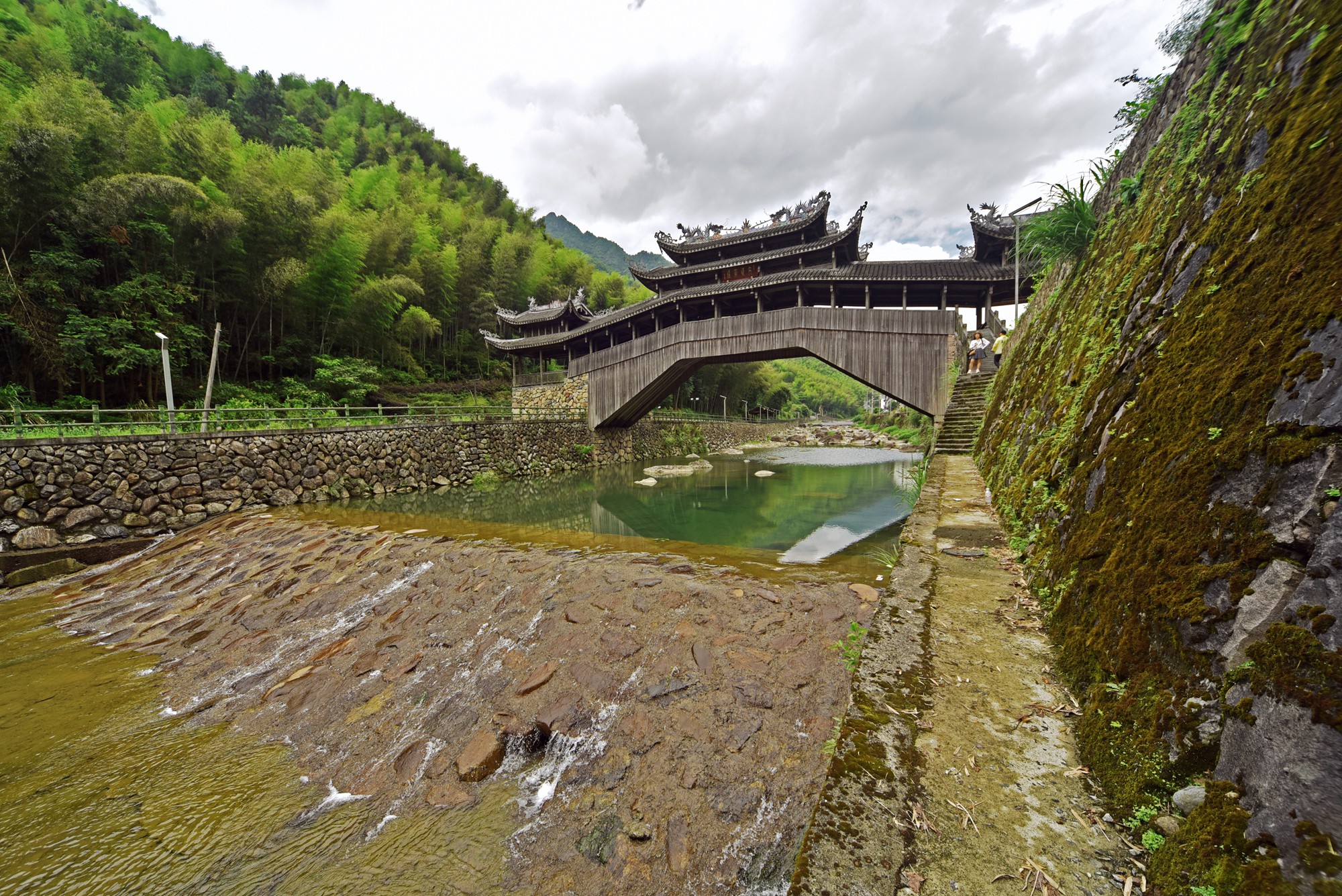虽然是现代建筑,但修旧如旧的手法看上去依然显得古朴而精美,走廊中央顶上是盘龙的图案,两边溪水潺潺,山林青翠,特别是竹林很有质感,加上廊桥独特的造型,特别适合穿上古装拍照。