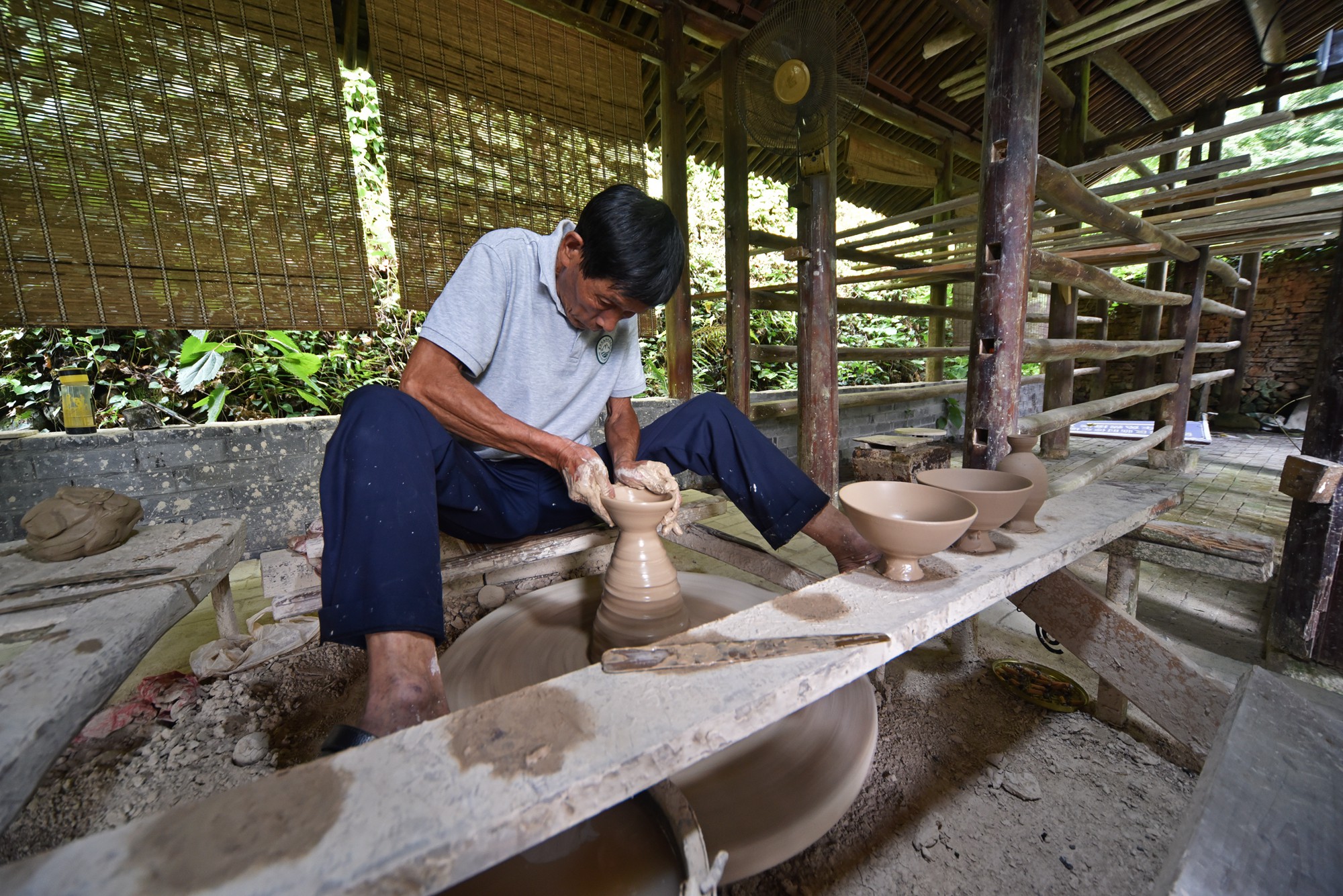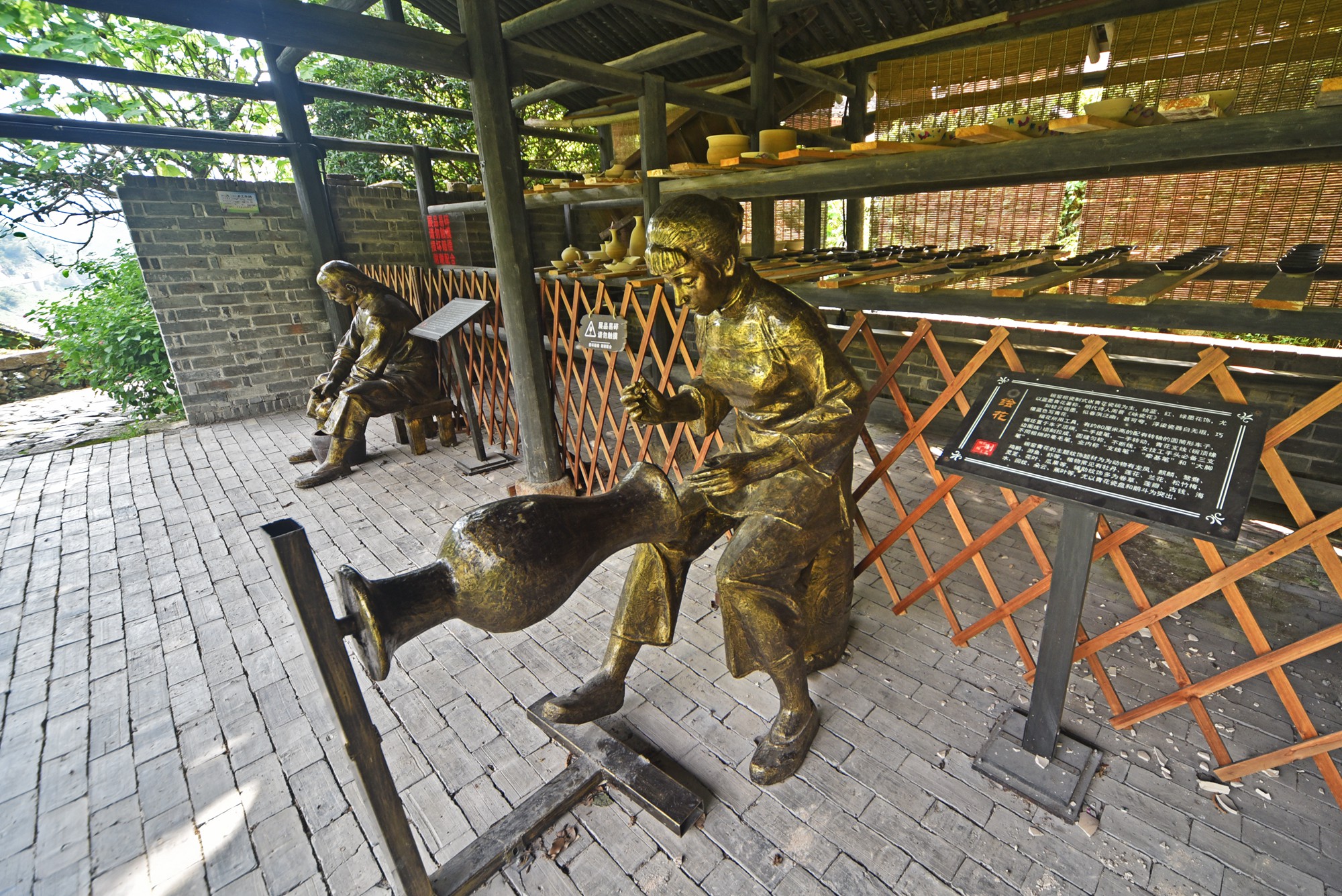 在碗窑古村,我们参观了古法制瓷的生产线,一个个雕塑,生动展示了制瓷工艺的不同步骤。村民利用自然坡度,将溪水引入村中,建成了八级水碓,共计46个捣臼组成半自动生产流水线,将山上开采下来的釉石原料舂成粉状,经过加工成为“熟土”,整个工序溶合了水利动力学、机械学、力学、液体力学和陶瓷工艺学等诸多学科,让我们对古人开发利用自然的聪明才智十分佩服。老师傅为我们展示了拉坯工艺,一块块泥在他的手中做成了不同造型的碗。