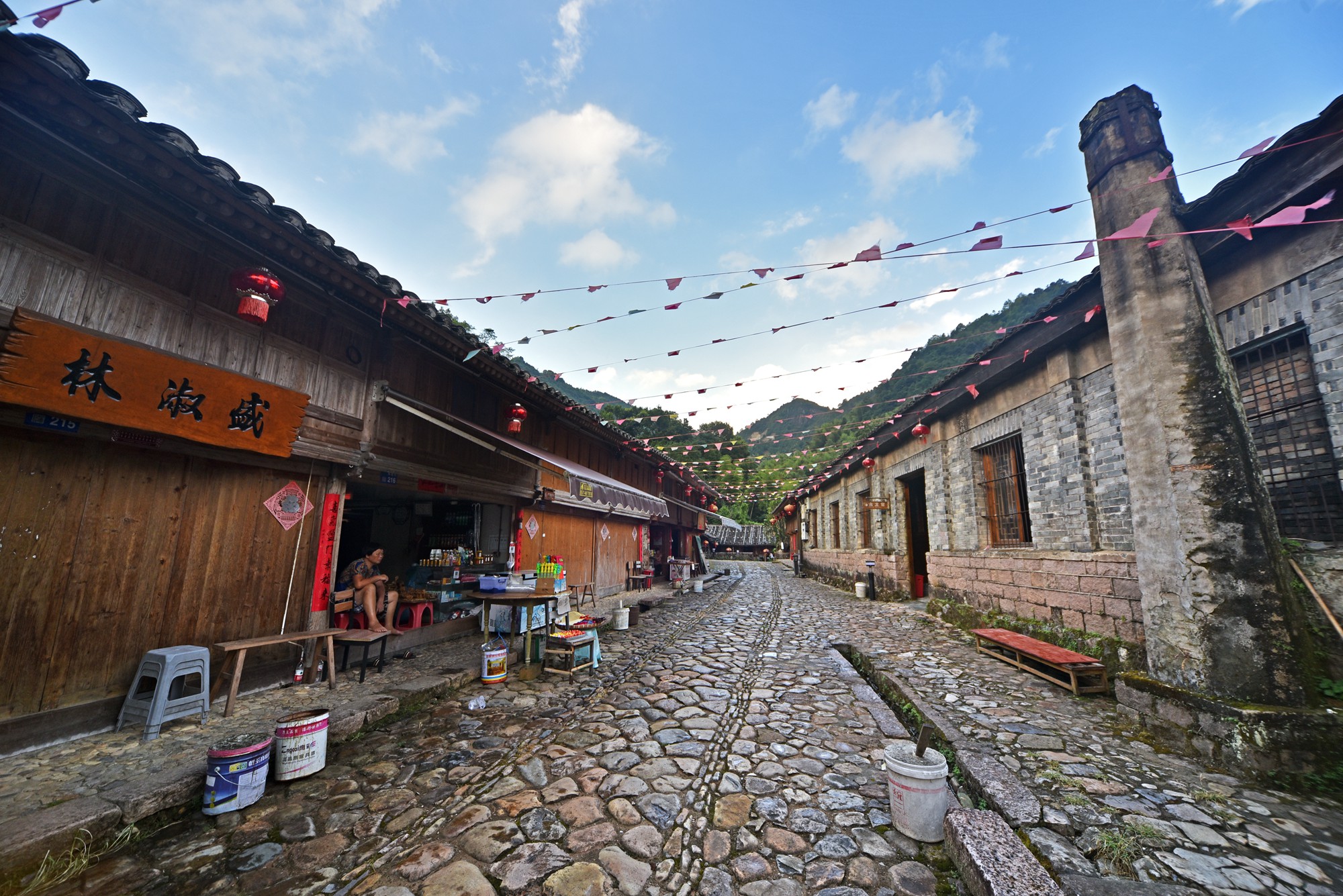 老街不算长,也就100米左右,沿街建筑均为二层阁楼式,门面间宽约3米有余,进深10—11米。街面用石块铺设,经过多年的打磨已变得十分光滑。我们来的时候正是盛夏季节的午后,街边很多店面没有开门营业,错过了当地的美味小吃。街口溪边有两棵百年老树,一条长长的石矴步桥跨溪而建,连接起老街和新街。