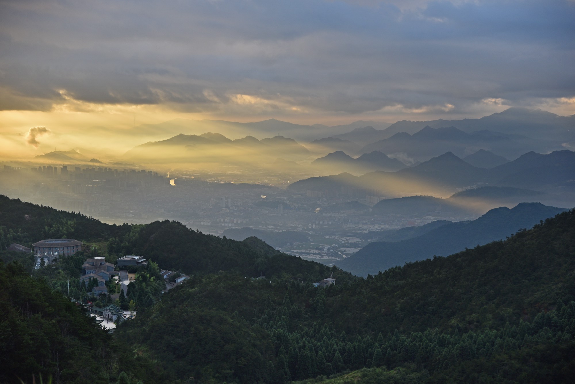 清晨,当第一缕阳光穿过云层,给山林石壁披上了一层暖色,远处的苍南县城群山环抱,阳光透过云层间隙投射出一道道丁达尔光,再往远看,海平线依稀可见。