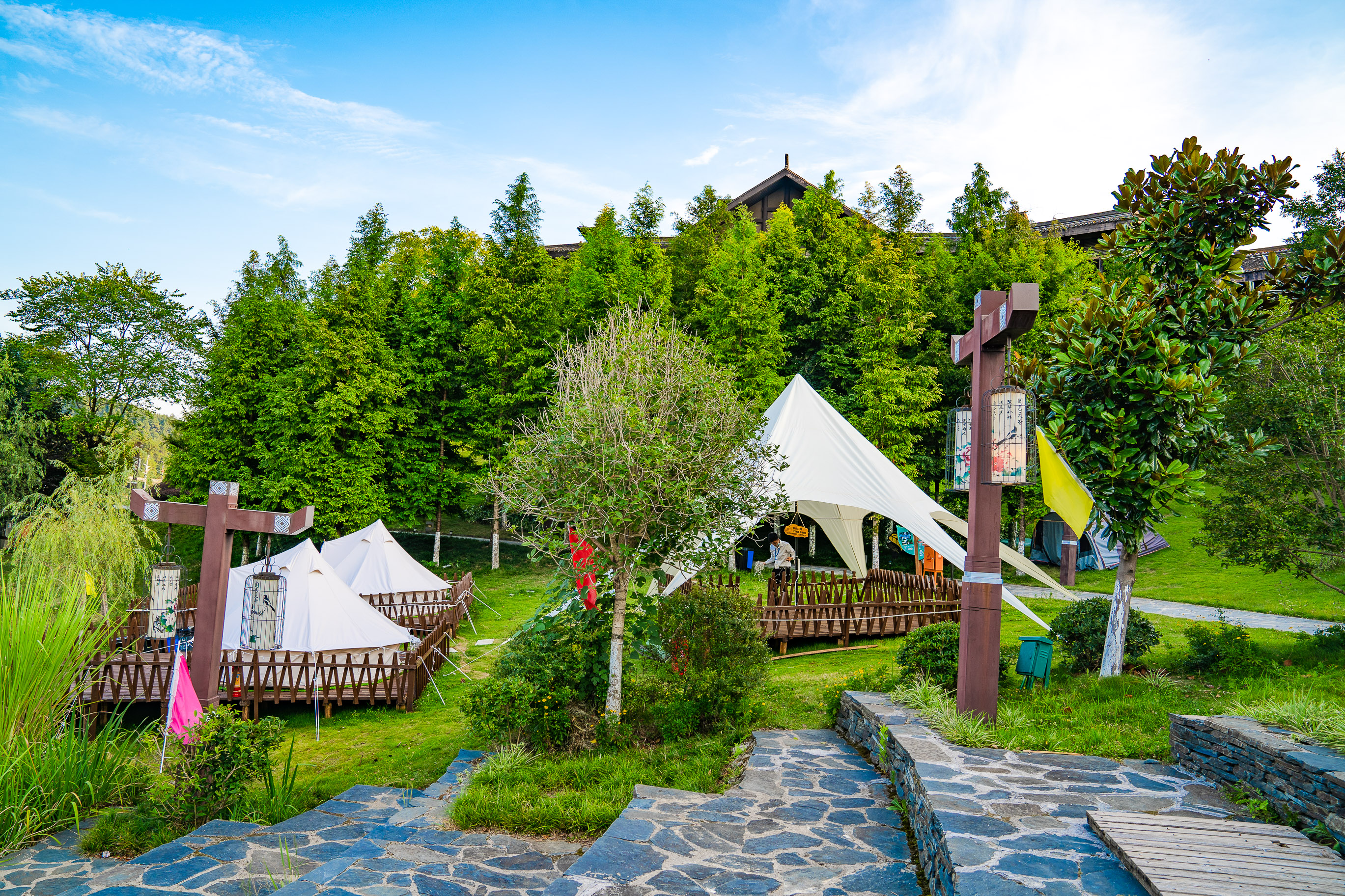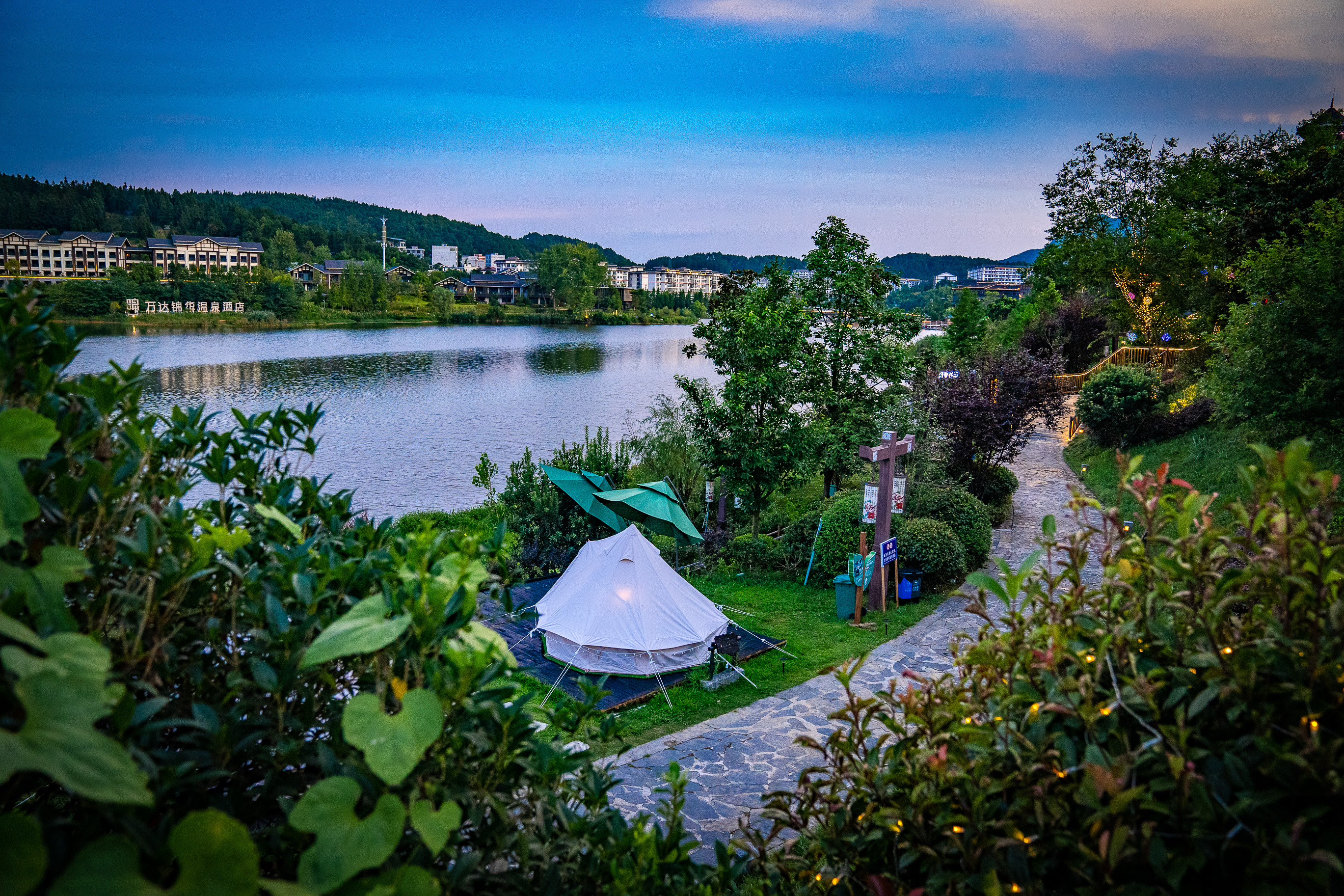 在丹寨万达小镇的东湖畔,还有一处星空帐篷营地。湖畔、草地、树林,统统都有,非常安逸。