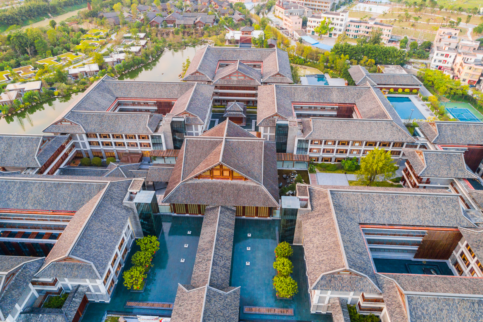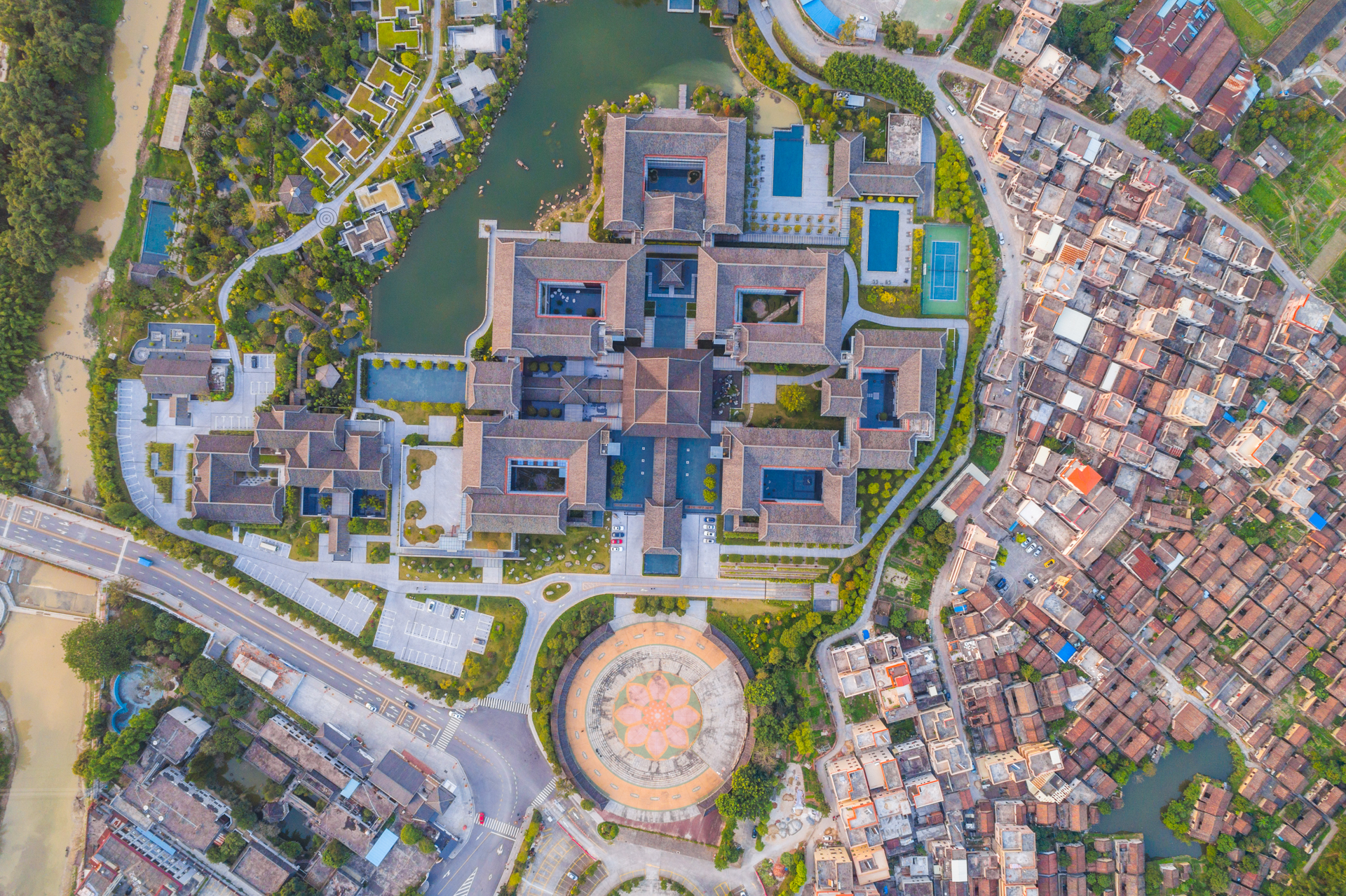 作为南中国首家“禅文化”主题酒店,坐落在广东云浮新兴六祖故里、国恩寺旁。一座融合中国古典文化、禅文化、红木文化的建筑。(游客正常是不可以航拍酒店,保安时刻都在盯着,我背了一个包,酒店保安一眼就认出里面放了无人机,需要得到酒店经理同意后才能飞)