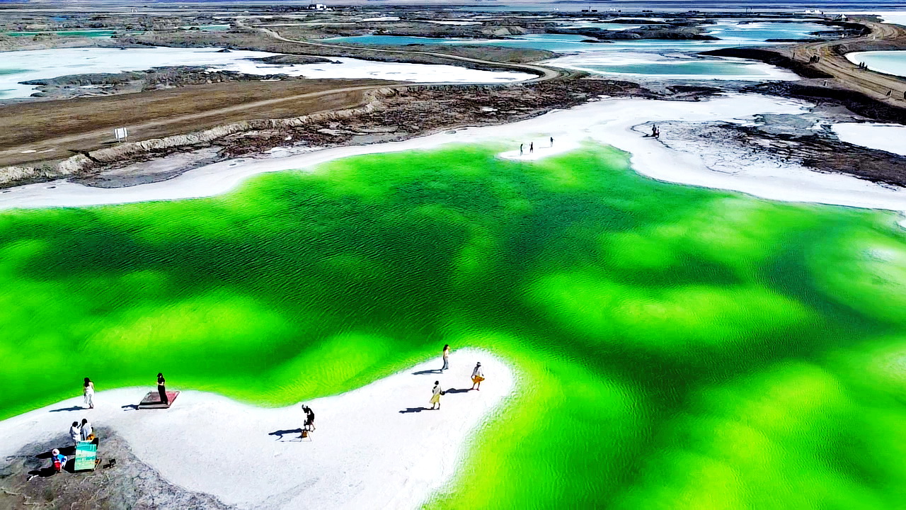 “翡翠湖”原是盐化工厂采矿的废弃矿坑,因坑中盐水的浓度不同,以及所含矿物质的差别,形成了一个个色彩各异的晶莹剔透小池。荒漠中盐池形状迥异、深浅不一,色彩有别,仿佛洒落人间的一颗颗翡翠、玛瑙,被人称为“打翻的调色盘”。