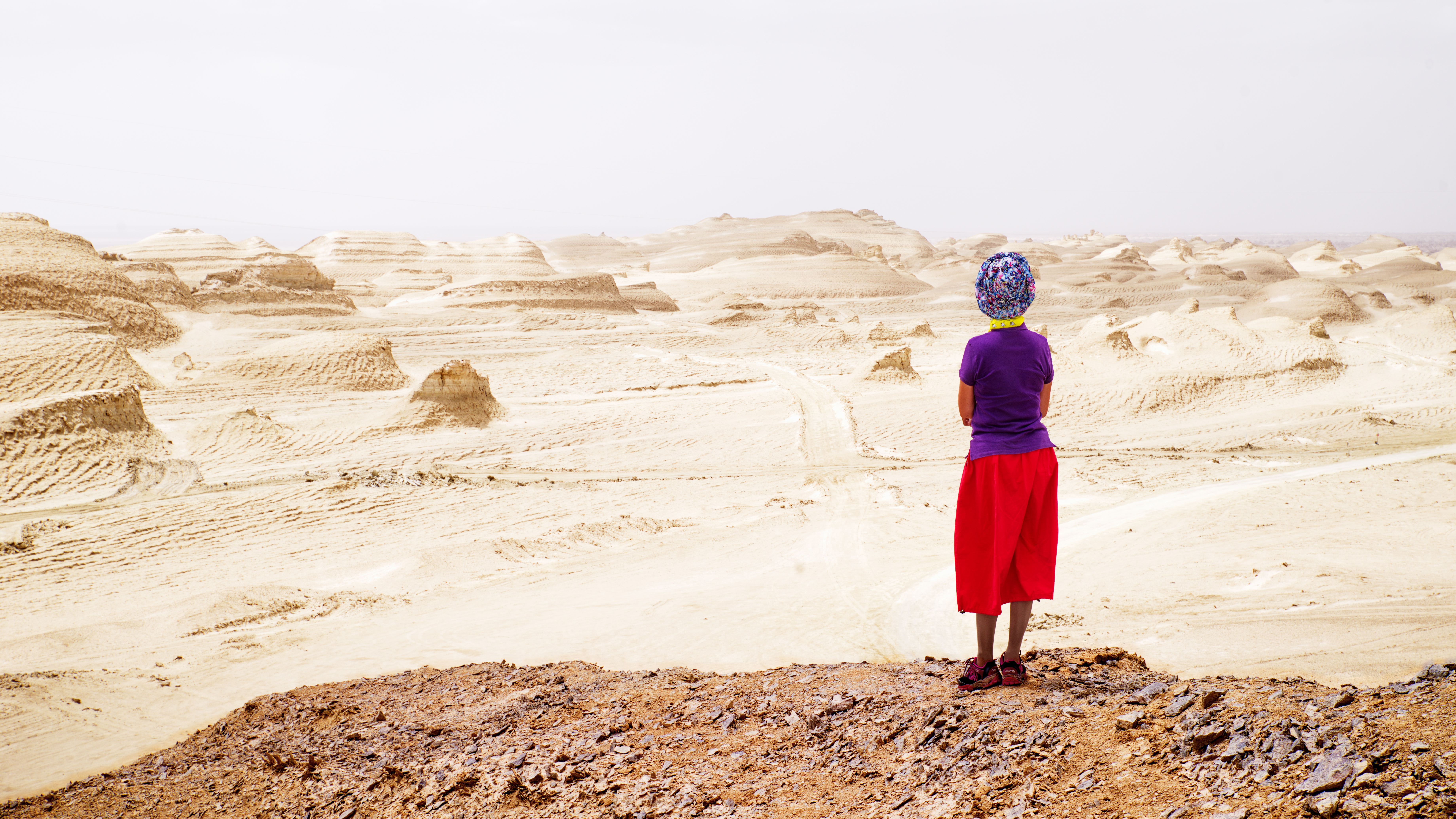 大风雕刻出姿态别致的嶙峋雅丹和水墨画似的黑粉山丘……
