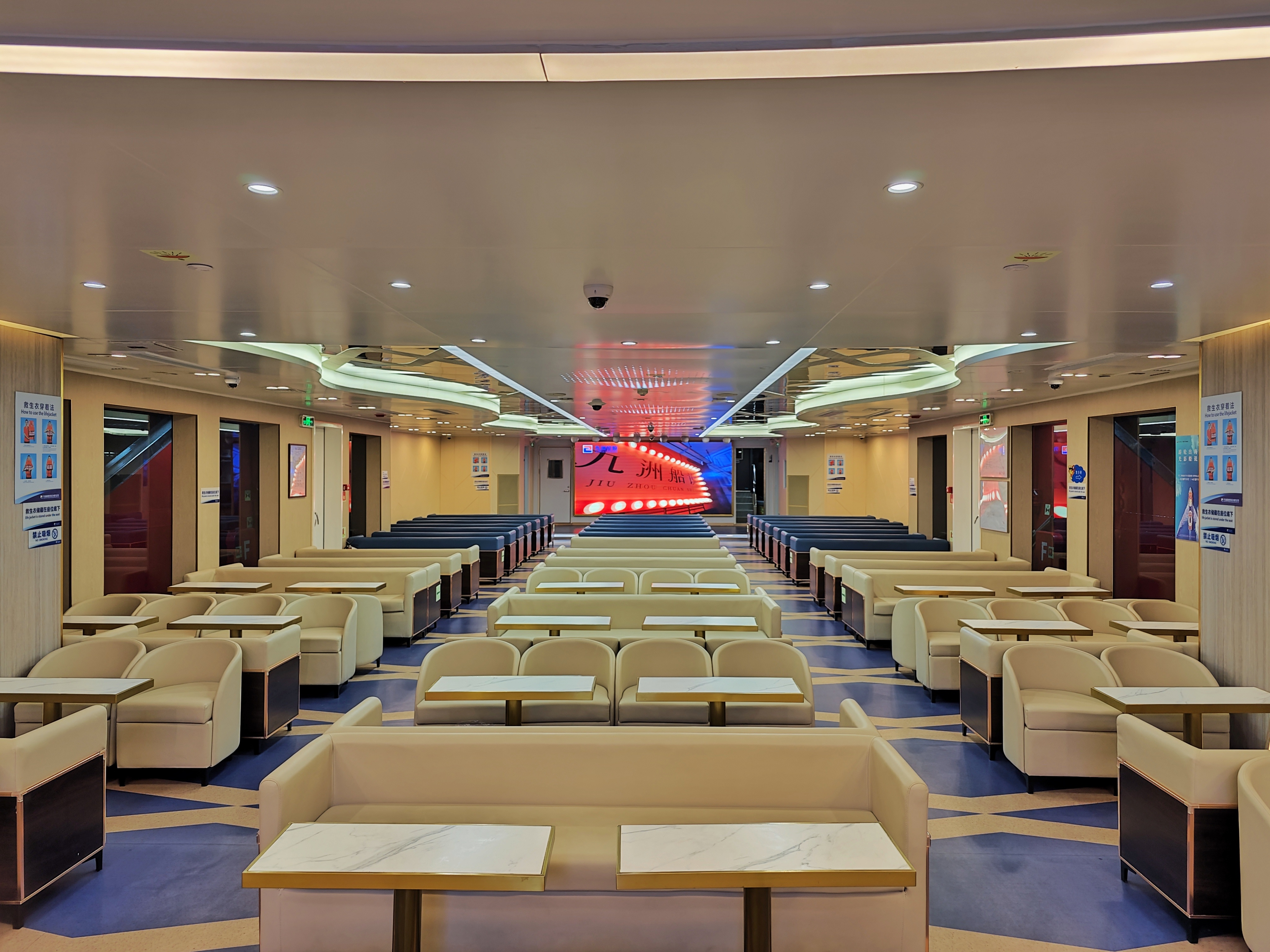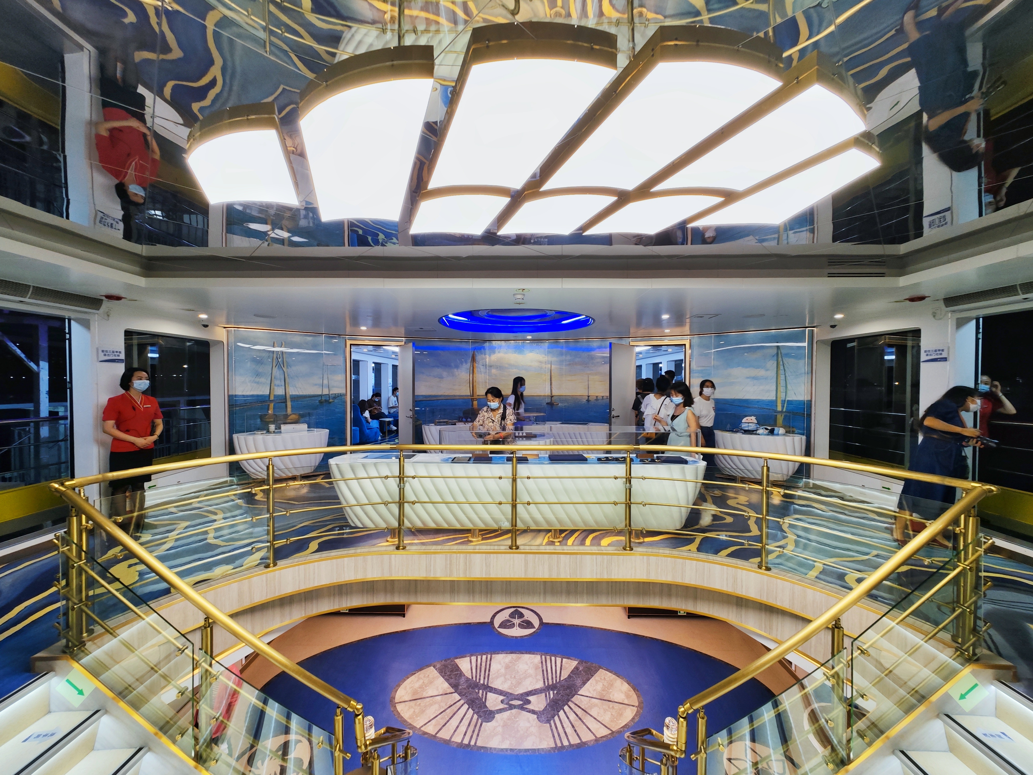 内饰融入国潮文化、海洋风情和科技元素,堪称是集现代设计感和中国传统美学元素于一身的粤港澳大湾区海上旅游观光新名片!