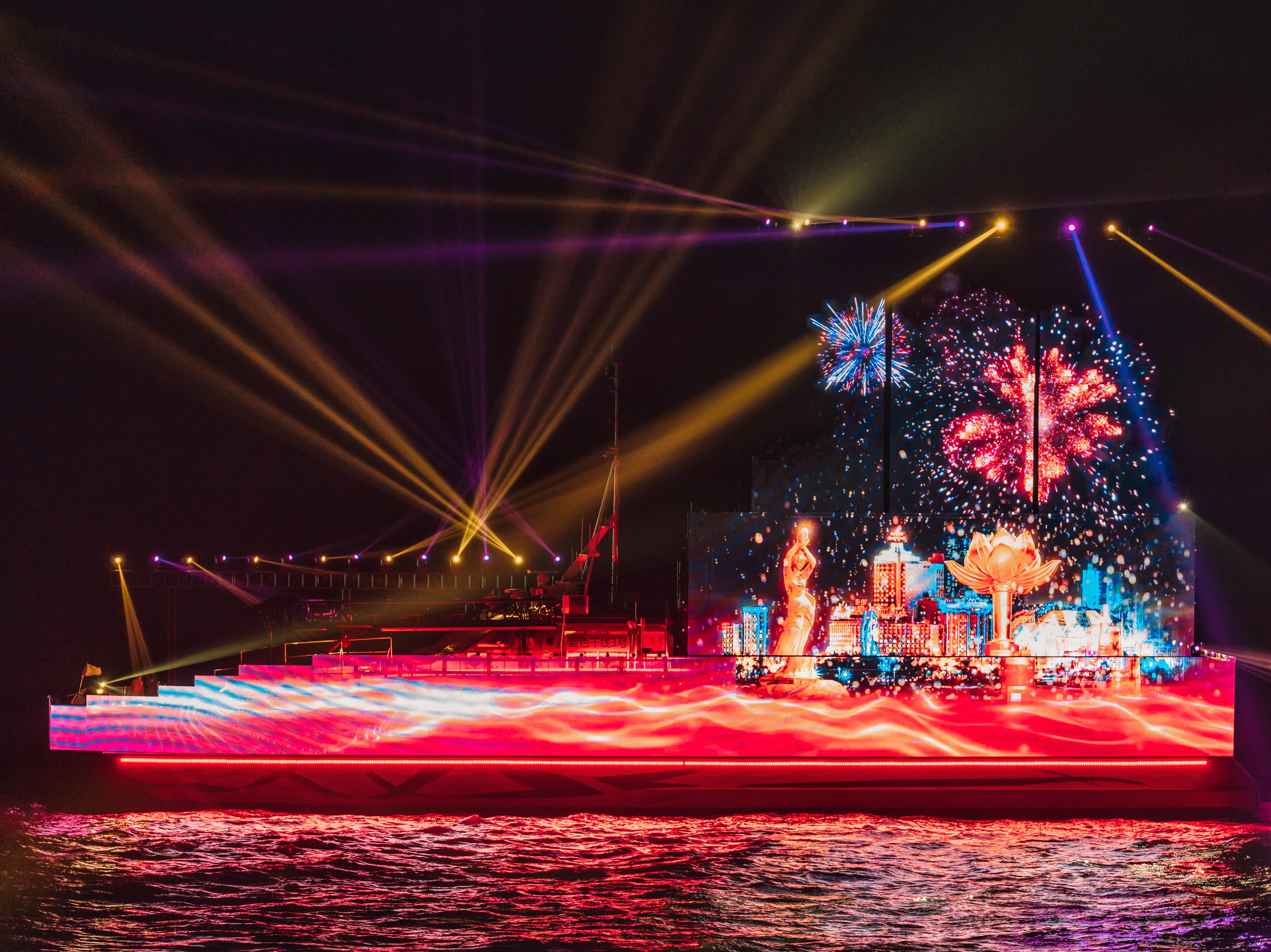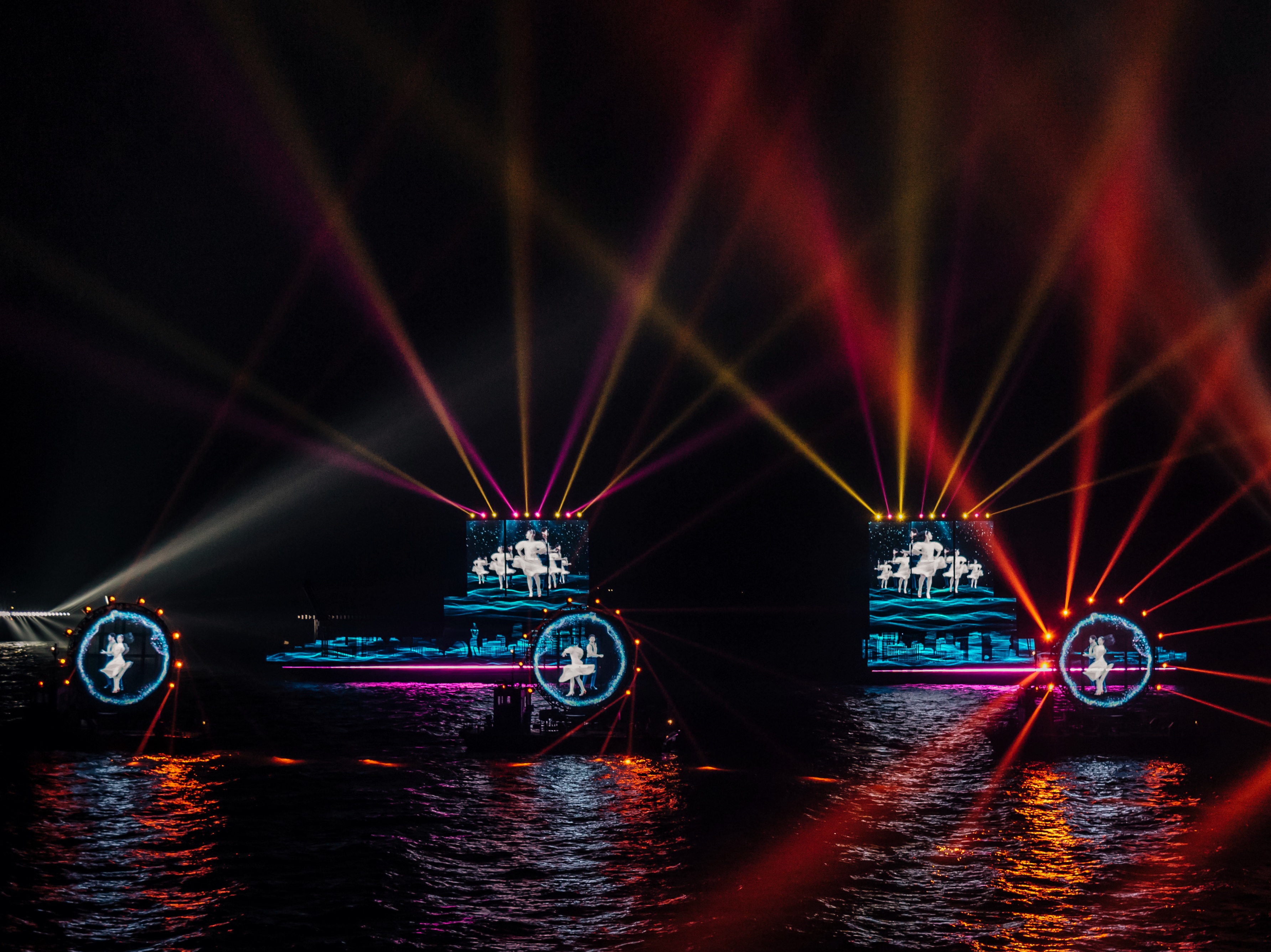 在-30℃至60℃的温度中皆可正常工作、屏体距离水面仅2米仍无惧强风大浪的1026㎡海上冰屏巨幕乃中国首创!“黑科技”加持下的屏幕拥有超强的延展性和丰富的画面信息量,无论是挺立于大海之上的巍峨雪山、飞旋于波涛之间的舞者、颇具地方特色的东西建筑还是漫天绚烂的烟火,景随船动、人随景移……视觉体验一级棒!
