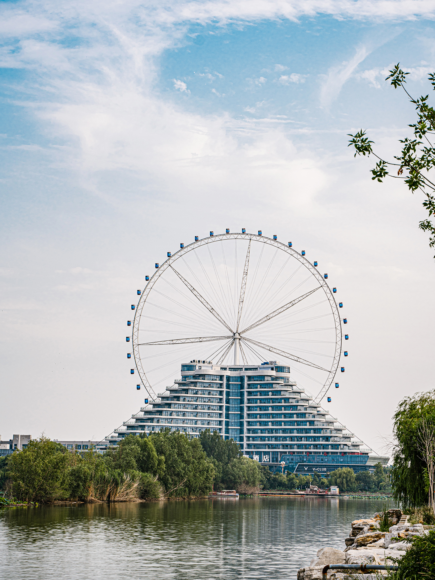 要说水城风光的点睛之笔,非水城之眼的摩天轮莫属了!这是全球首座建筑与摩天轮相结合的城市地标,14层楼体轮廓呈优美的波浪形曲线结构,远远望去,犹如徜徉在东昌湖畔的一艘巨轮,在建筑造型方面可谓独一无二。