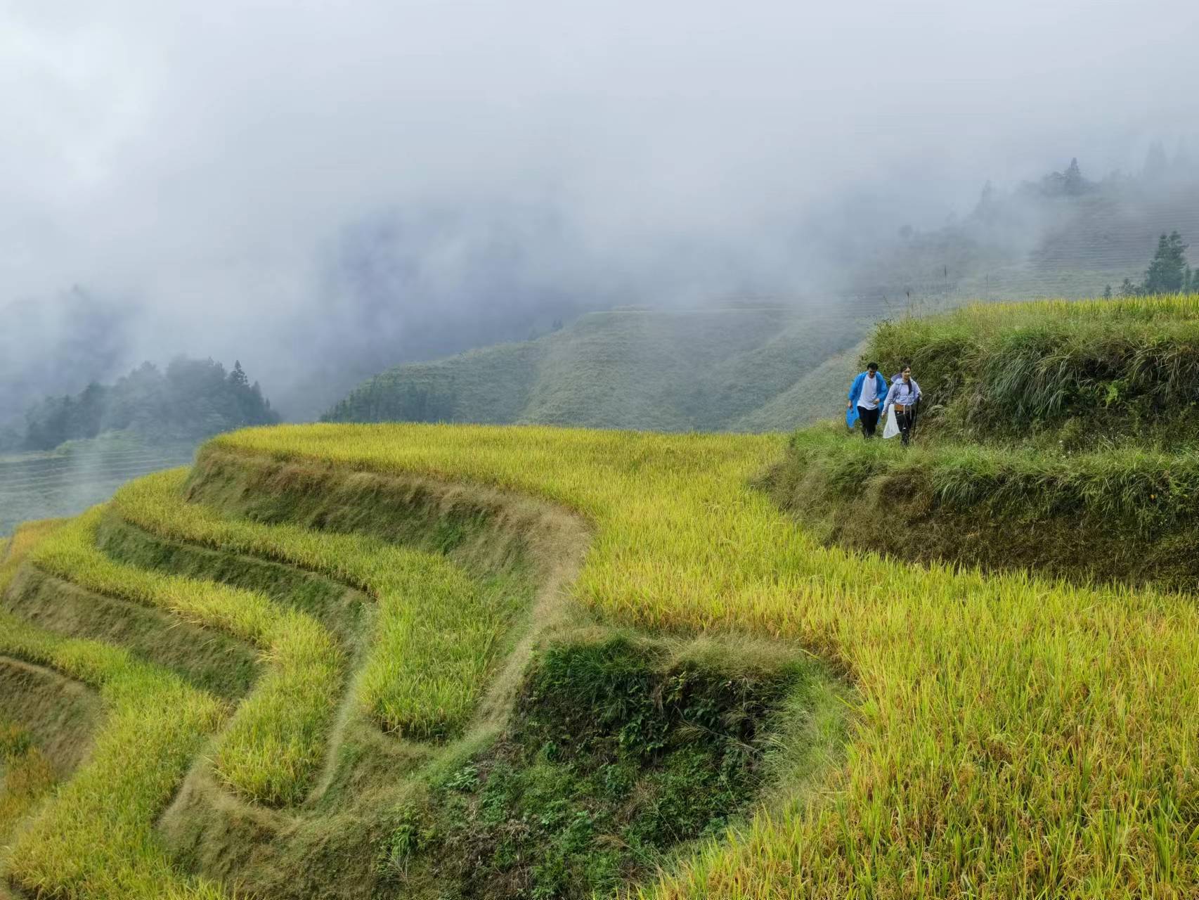 可惜的是,当天早晨下了一场雨,雾气朦胧,眼前呈现的是云海中的梯田,更增添了一层空灵的意境。