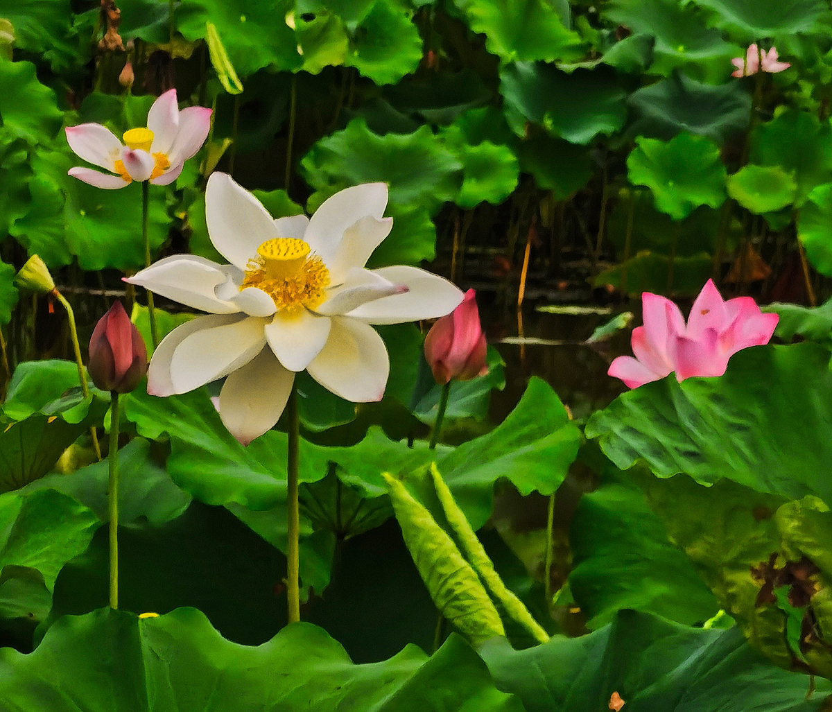 途中路过一“荷花源” 民宿,门前时一片诺大的荷花池。我们在这里休息且吃了午饭,拍了上午的荷花池,那正是含苞欲放之时。
