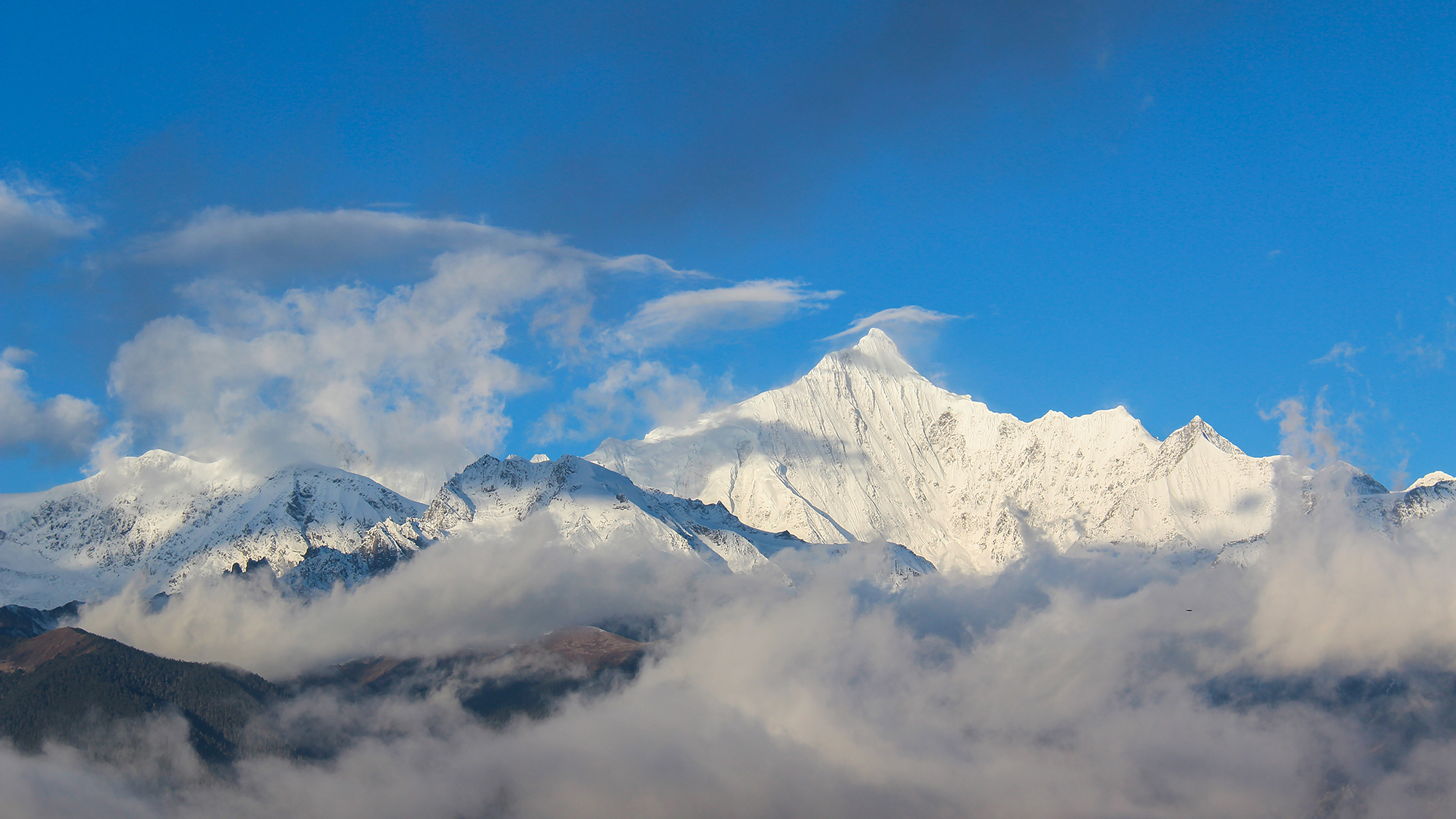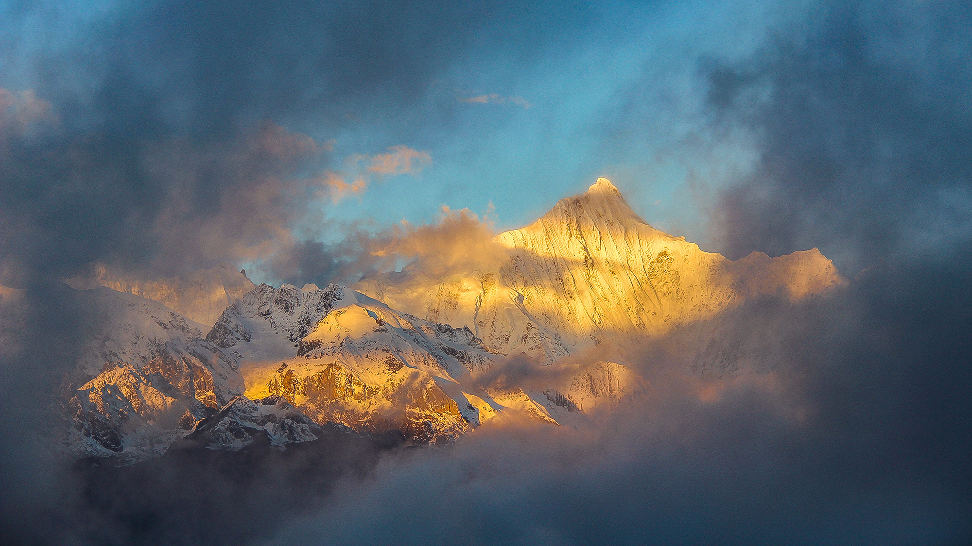 一年中的很多时候,卡瓦格博难得尽显雄姿, 怒江与澜沧江河谷的水汽时常聚集在雪山之巅,形成终日缭绕的云雾,让很多人痛惜与其缘悭一面。若有幸看到卡瓦格博的雪山之巅被第一缕曙光照亮,定是精诚所至。