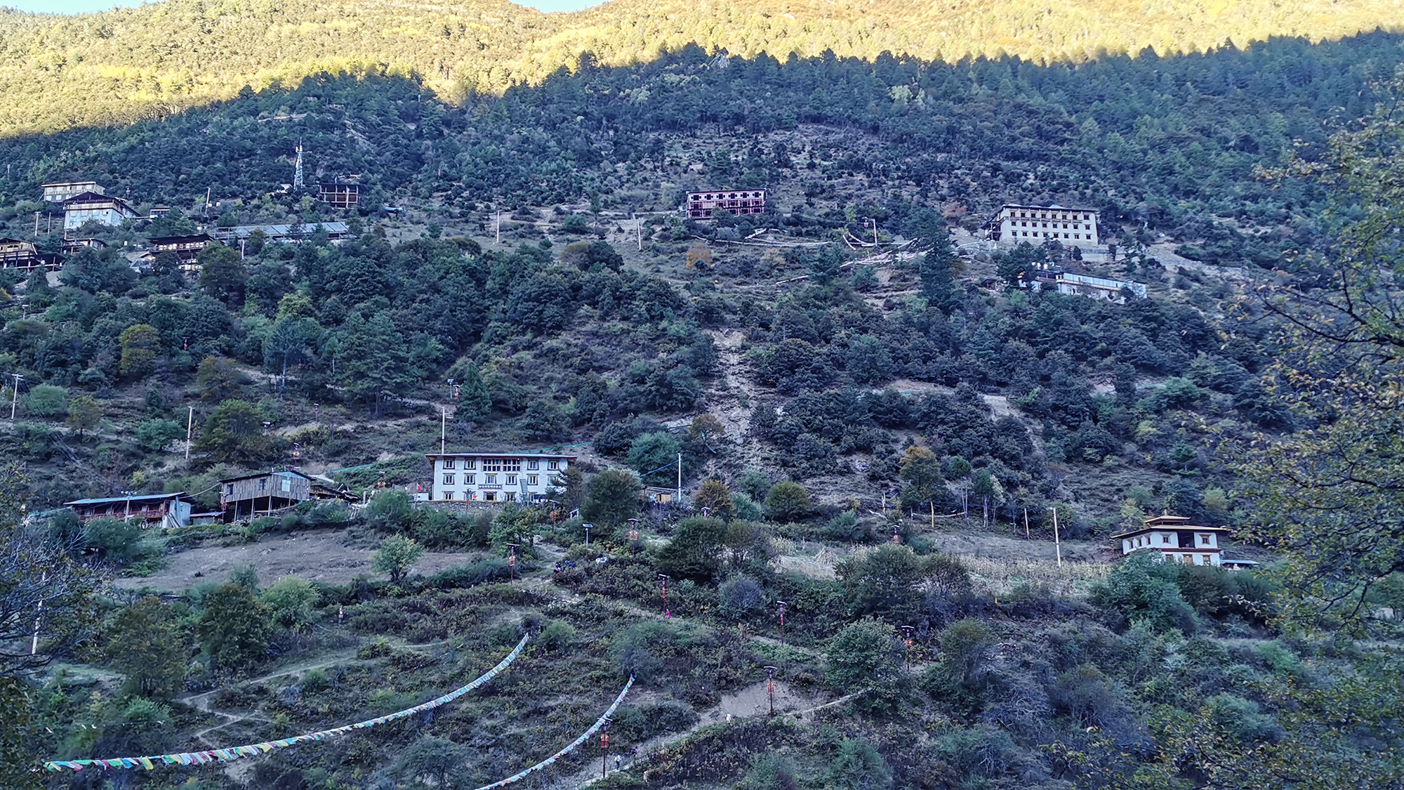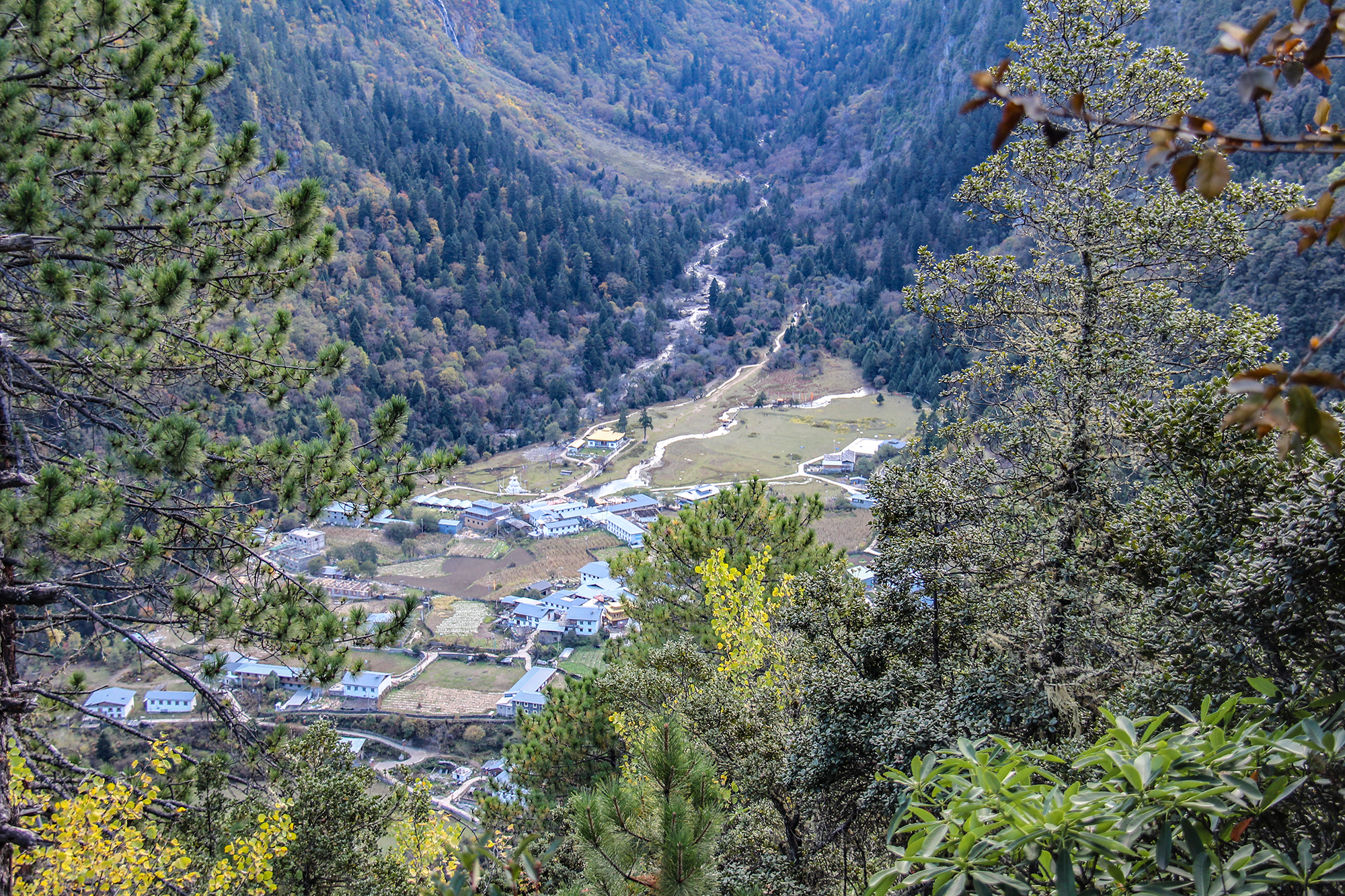 从南争垭口下山途中,远远望见碧绿田间的几座屋舍,这便是雨崩村了。