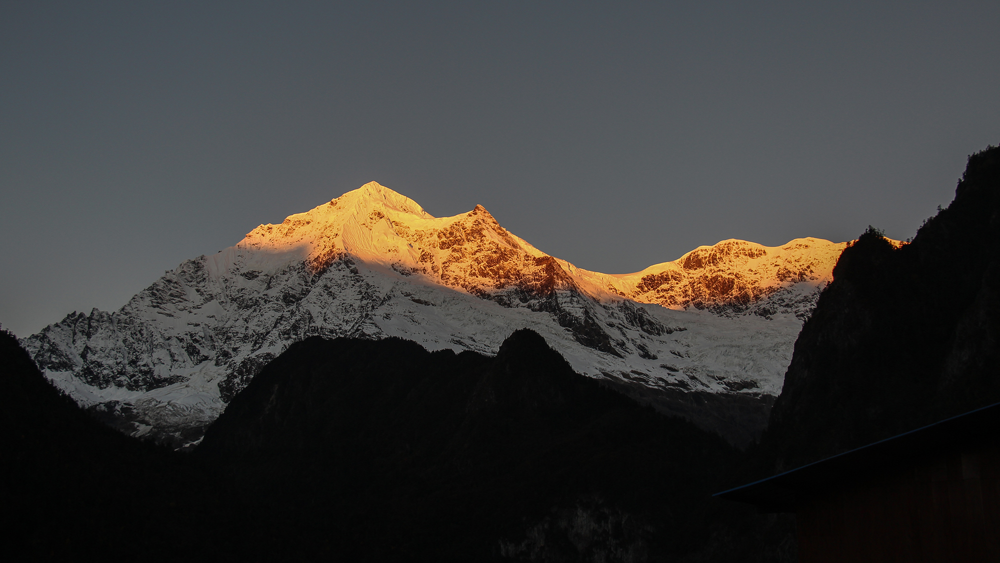 当清晨的第一缕曙光点亮主峰卡瓦格博的最高点时,金字塔状的主峰开始至上而下被慢慢染红,卡瓦格博如英雄般被披上鲜红的斗篷,与传说中一样英俊魁梧。最南侧的缅茨姆峰(神女峰),形状形似主峰,却又多了一些俊俏婀娜,此时也被轻轻点亮,而她的脚下,便是此行真正的去处—— 雨崩 。
