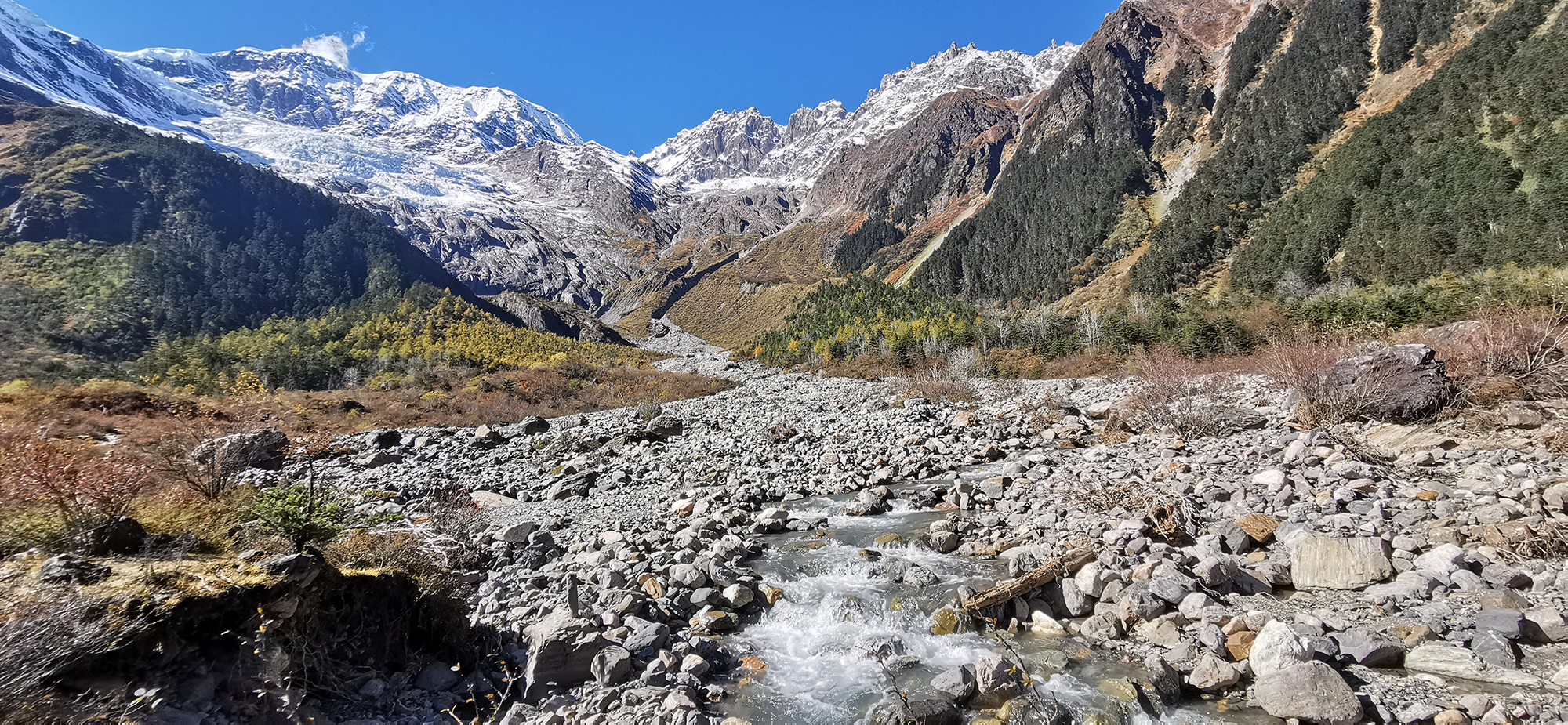 两岸山峰高大数树木茂密,高耸的两山之间夹着一条湍急的河流,这就是雨崩河。河水一路奔腾咆哮,沿着河一直走就可以走出雨崩 。