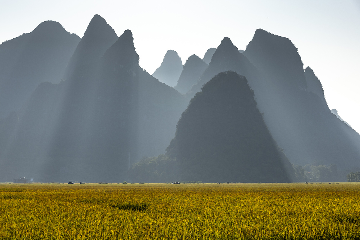 田心村是离桂林市区不远的一处未开发的原生态村落,这里是被喀斯特群山包围着的一处世外桃源,难得的是至今还保留着纯朴的乡土气息。如今水稻已经成熟,稻田在晨光下更显金黄通透。