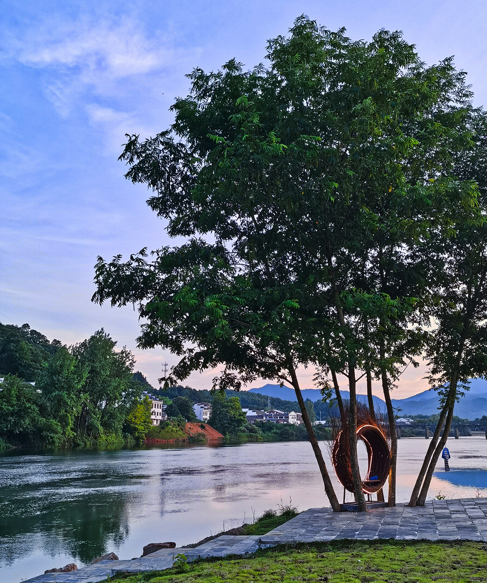 望过去,东岸灰白色的徽派民居掩映在绿色的树影下、倒映在江水中。蓝色的天、蓝色的水,足以让人们的心灵也安静了下来。