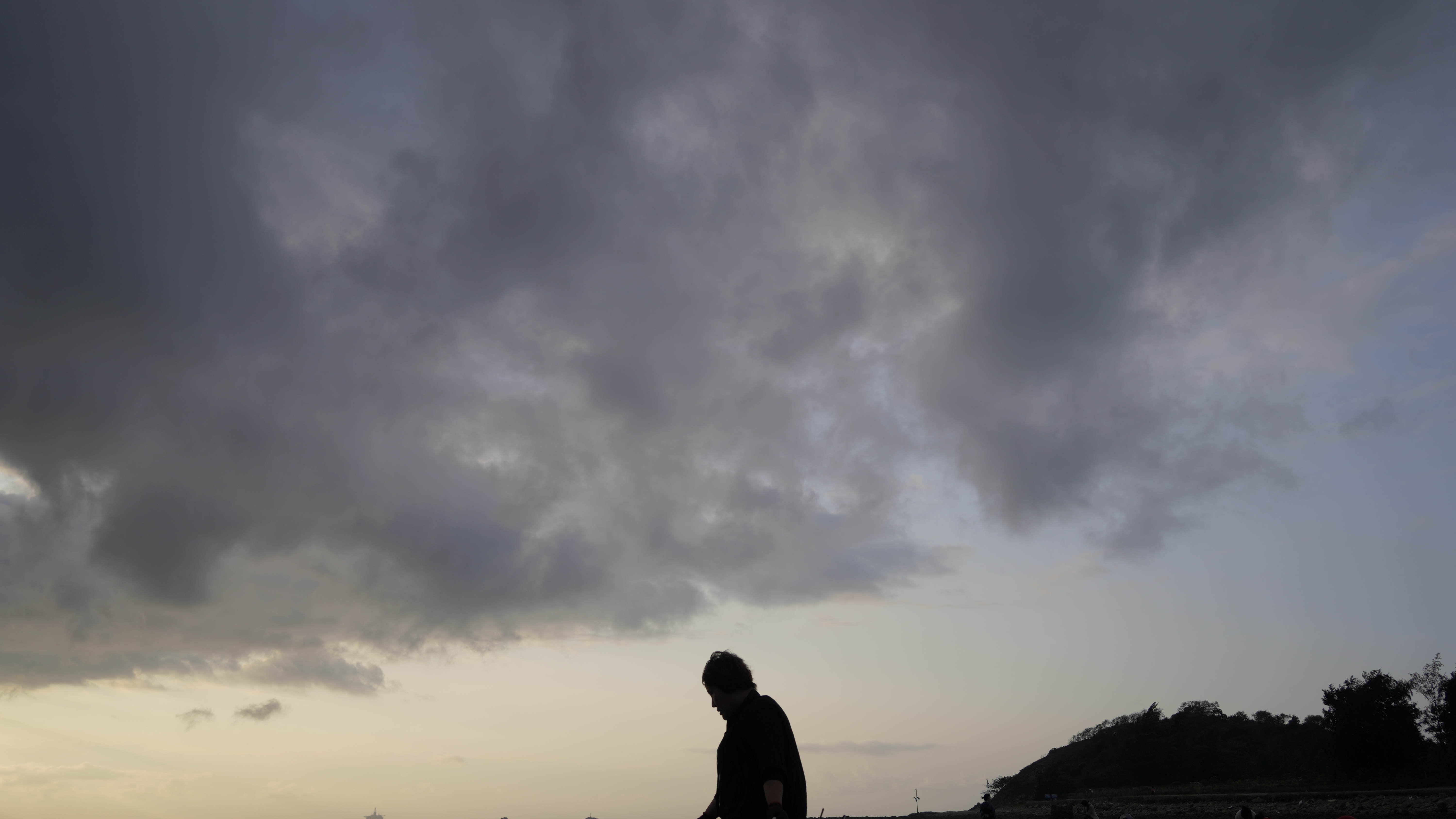 晚上小住一晚,早上起来跟着旅店的老板去赶海,真是老天照顾,走到海边,雨竟然停了。阴霾的天色渐渐有了朝阳暖红色光。在黑压压的乌云下,光穿过云层,照在对岸的山顶上,格外耀眼。