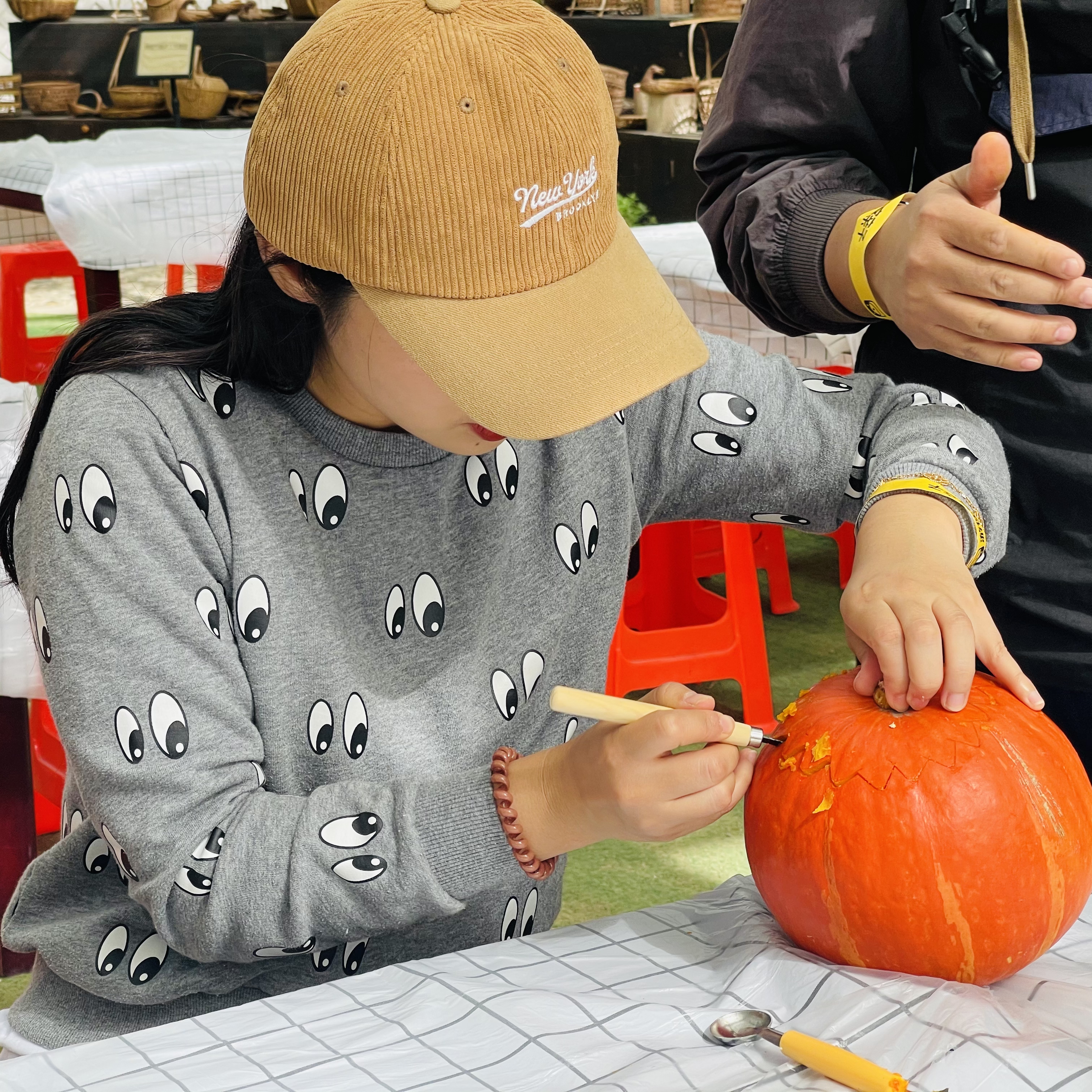 小鬼们再套上一个心仪的小南瓜,一起动手刻南瓜灯吧