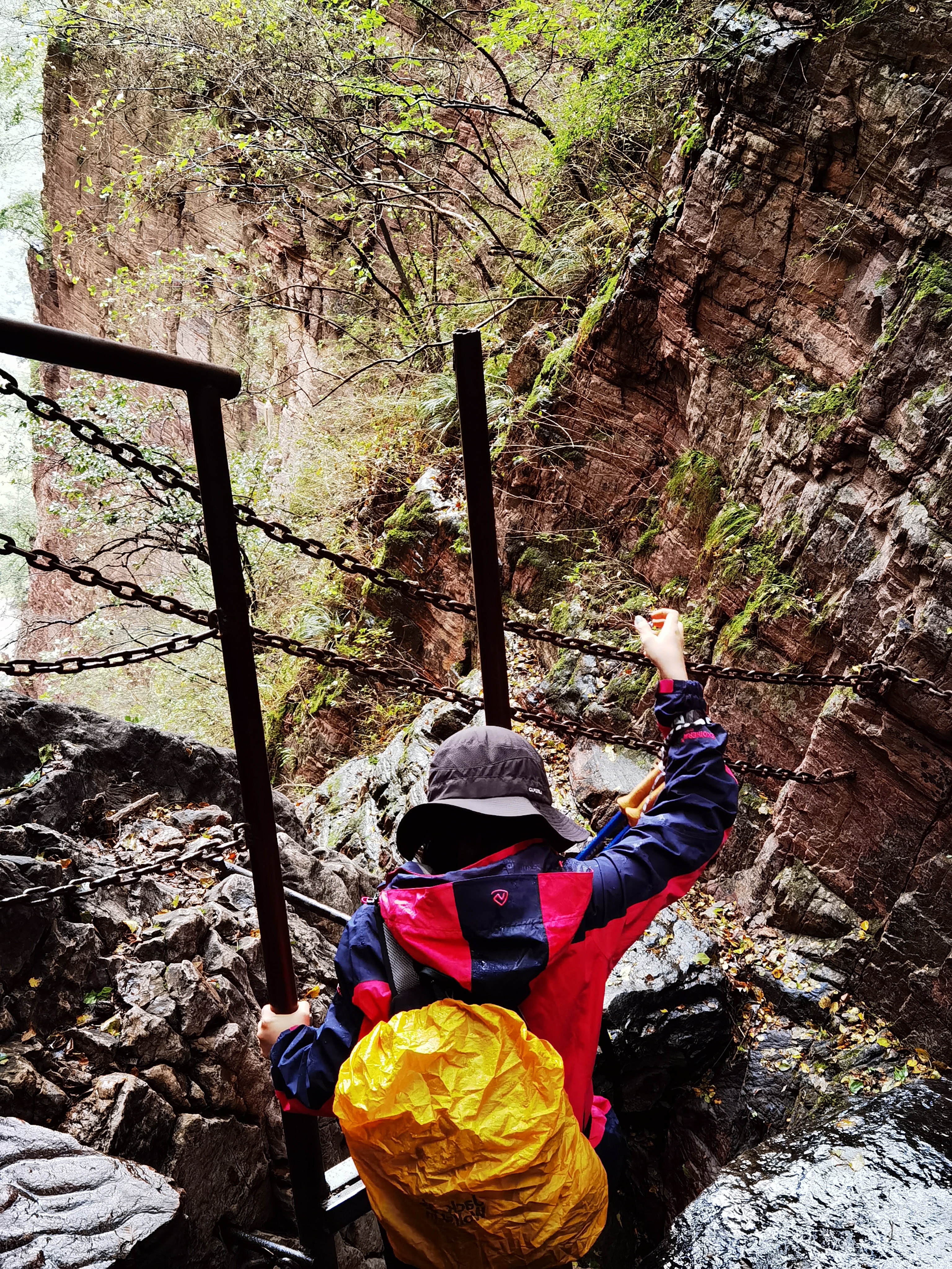 由于雨后相对较冷,大家稍作停留后便再次出发,一路你追我赶,终于在下午三点半左右到达一线天,而此前已有部分速度快的队员已经通过,这里是有名的挑战自己的地方,台阶陡而险,好在有铁链和扶杆,不然还真不好下,天雨路滑,小心翼翼拾级而下。