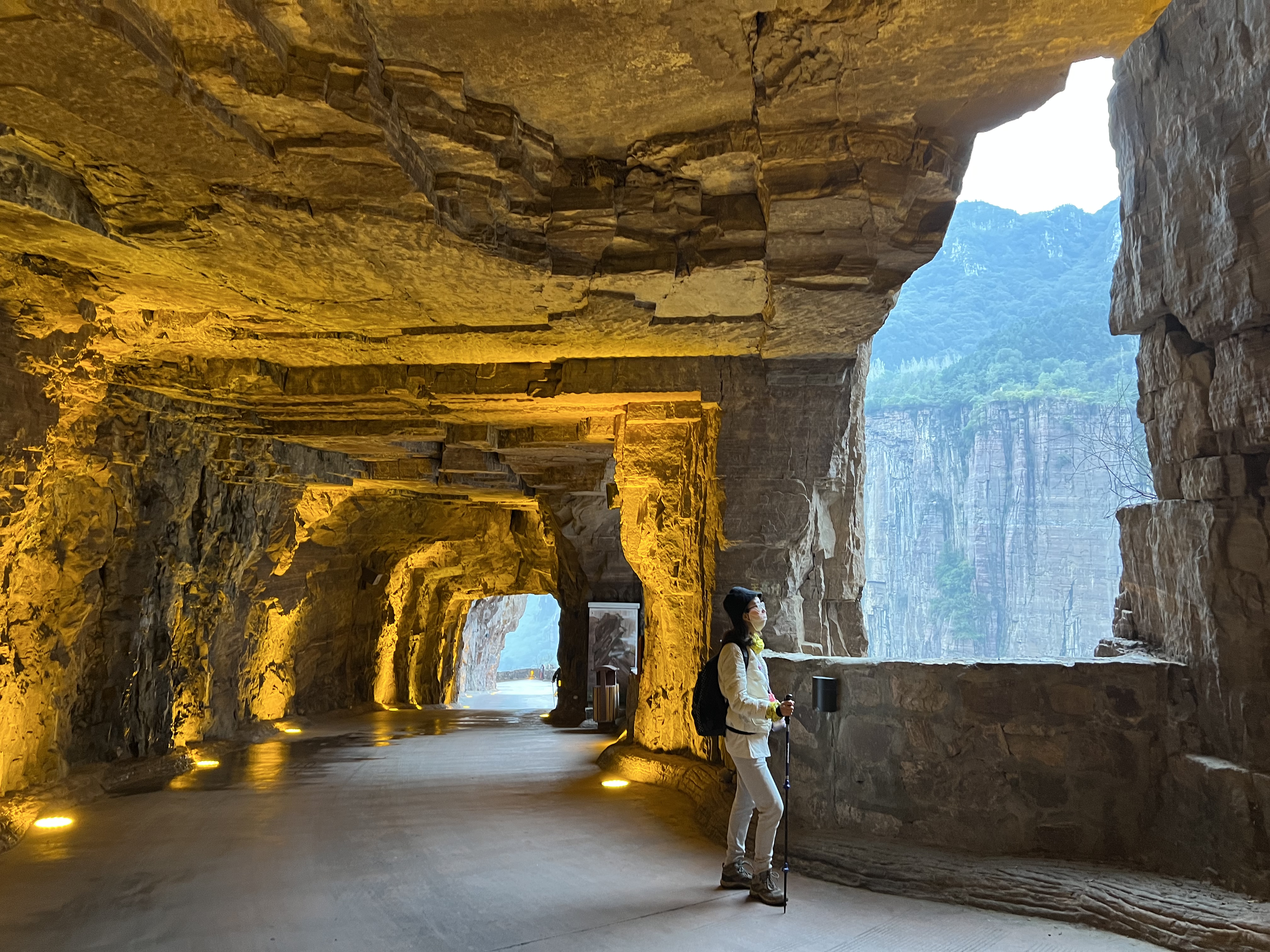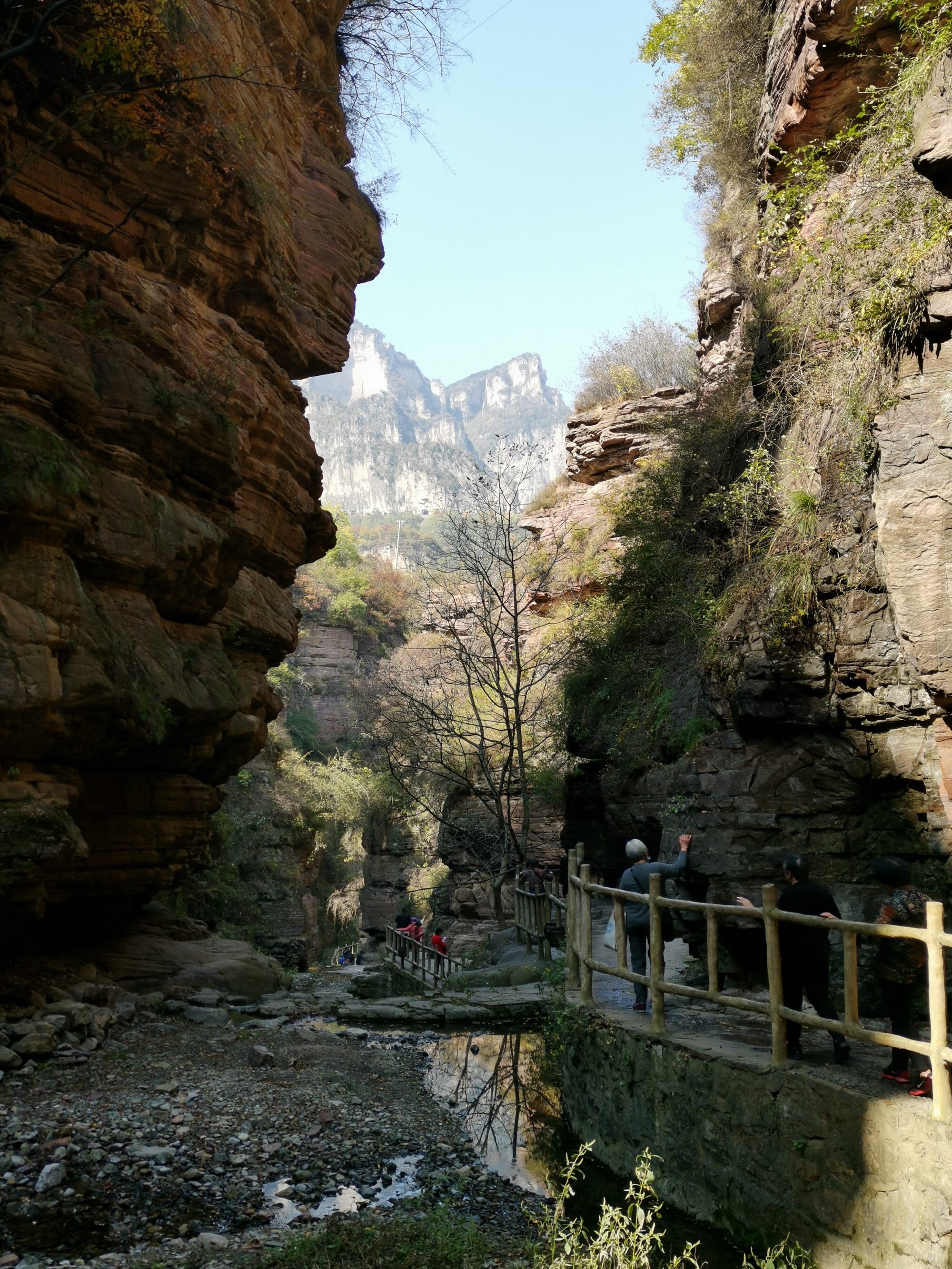 大约十点左右到达八里沟游客中心,全员顺利通过防疫检查后坐景交车前往景区旁的酒店,到达后卸完行李轻装出行,因为领队已经预约好,大家陆续通过检票口进入景区,徒步正式开始。景区中一段行进后到达抱犊桥水门,从水门中穿过,感受作为一名客人最高的礼遇,随即进入野道前往抱犊天梯。一梯上下,豫晋之交,一阶之隔,为崖为沟,生动的描述了作为抱犊天梯的陡峭。踏上抱犊天梯的顶端迎面看到的便是作为豫晋分界石碑,左行为豫,右行入晋,由于一直在拔高,大家也有些累了,于是决定在这里修整及补充能量,小伙伴们各自拿出自己的路餐相互分享,其乐融融。