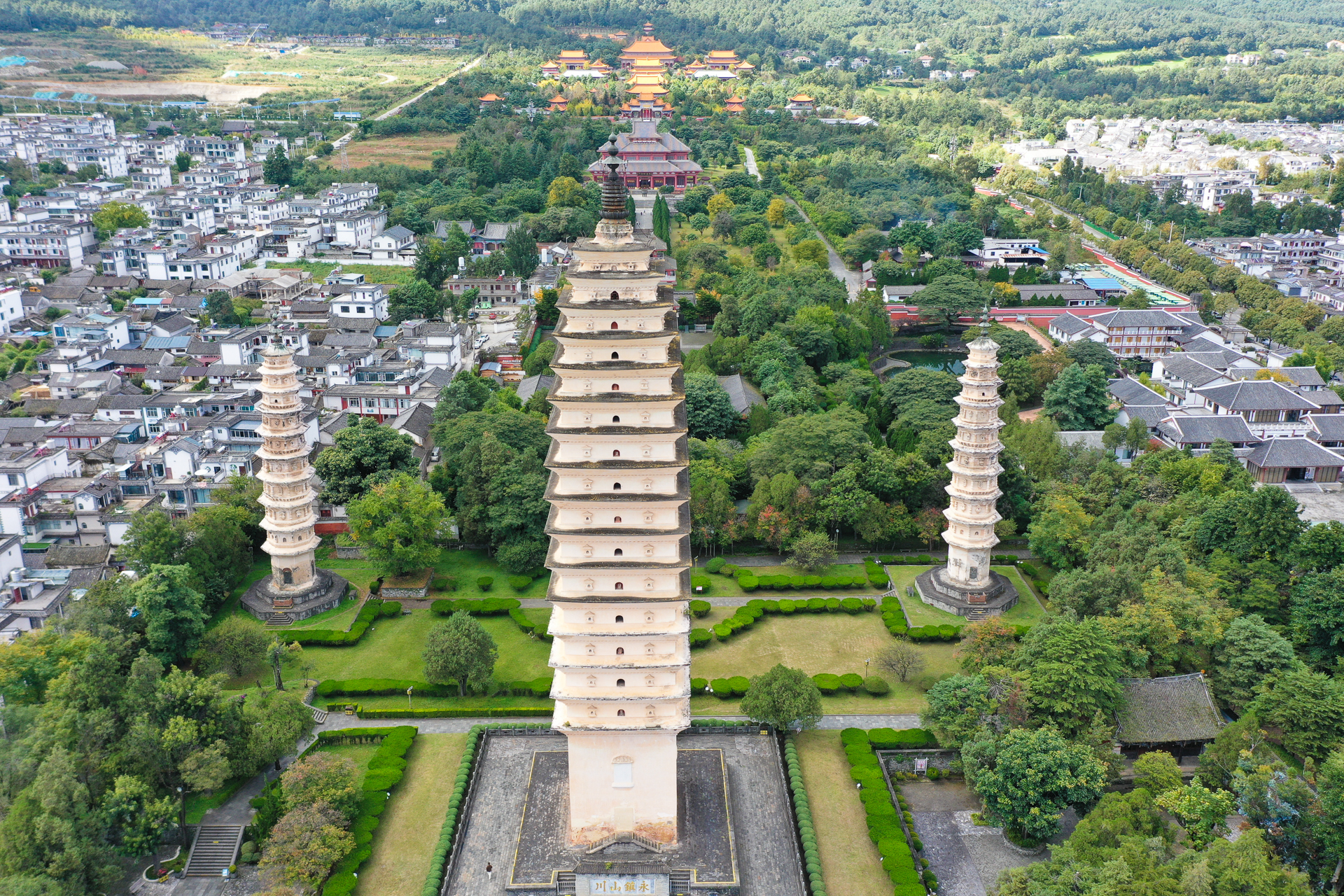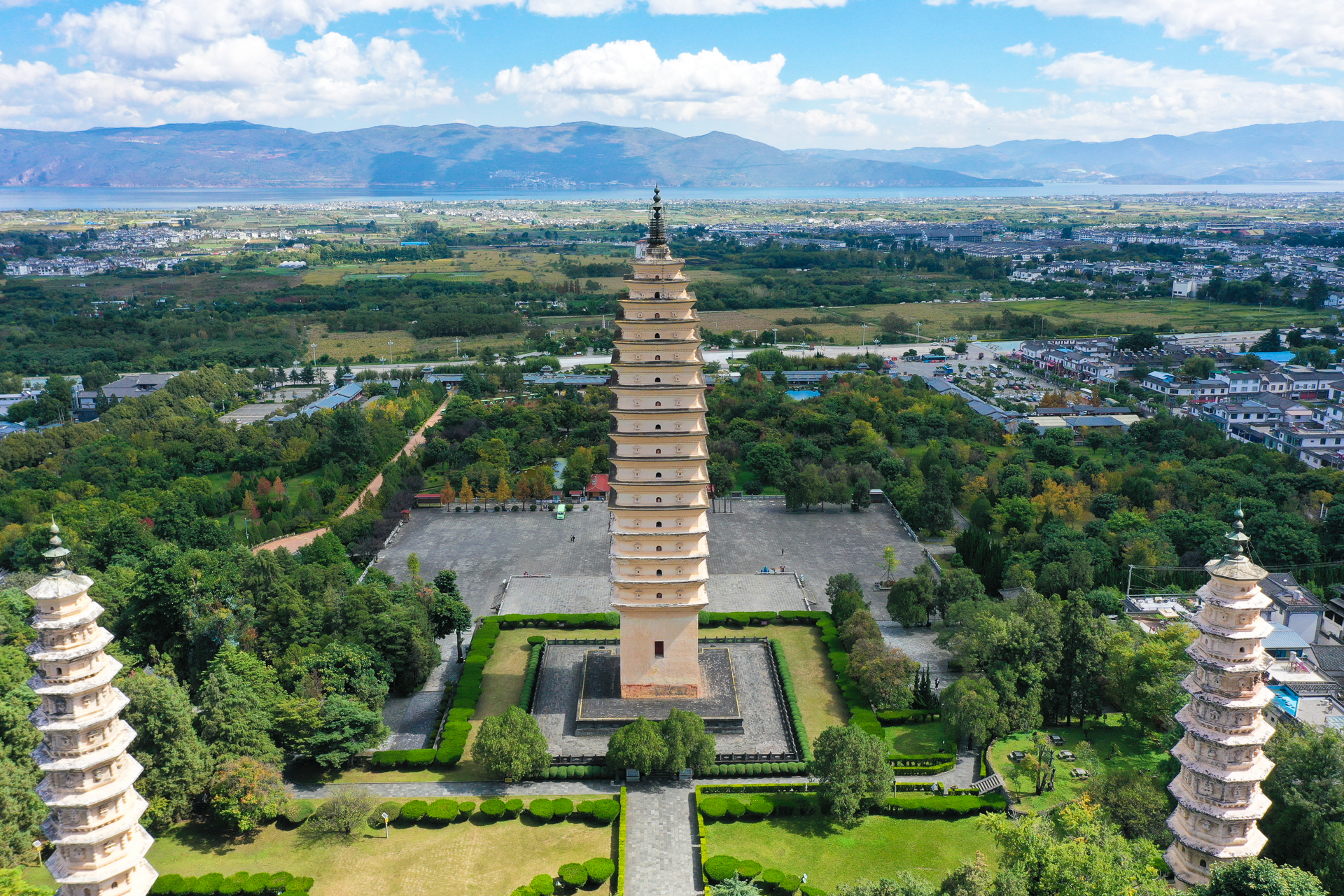 一说到 大理 的标志性建筑就会想到是 大理 的崇圣寺三塔,从偏门进入前面的三塔片区,远望三座宝塔,呈三足鼎立,背后是苍茫巍峨的苍山,构成一幅清新的青山宝塔之图画。圣寺三塔,由大塔及南北两个小塔组成,大塔在前,两个小塔稍后,是一对八角形的砖塔,10层,主塔到两个小塔的距离都是70米。
