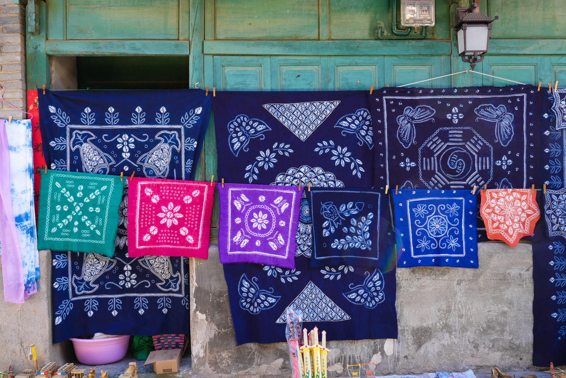 扎染是 巍山 民间流传千年的技艺,独特的传统工艺采用精湛而细致的手工技巧,在麻布或棉布面上勾绘出图案,随后手工按图案穿针引线,严密缝合后,再进入染缸侵染,每染一次,色深一层,经反复浸染后,出缸、漂洗、晾干、拆线后即成精美的手工艺品。2003年, 巍山 被国家文化部命名为“ 中国 民间扎染艺术之乡”。走在 巍山 古城街头,一系列扎染相关浮雕壁画,向人们展示民族民间珍贵的文化遗产。