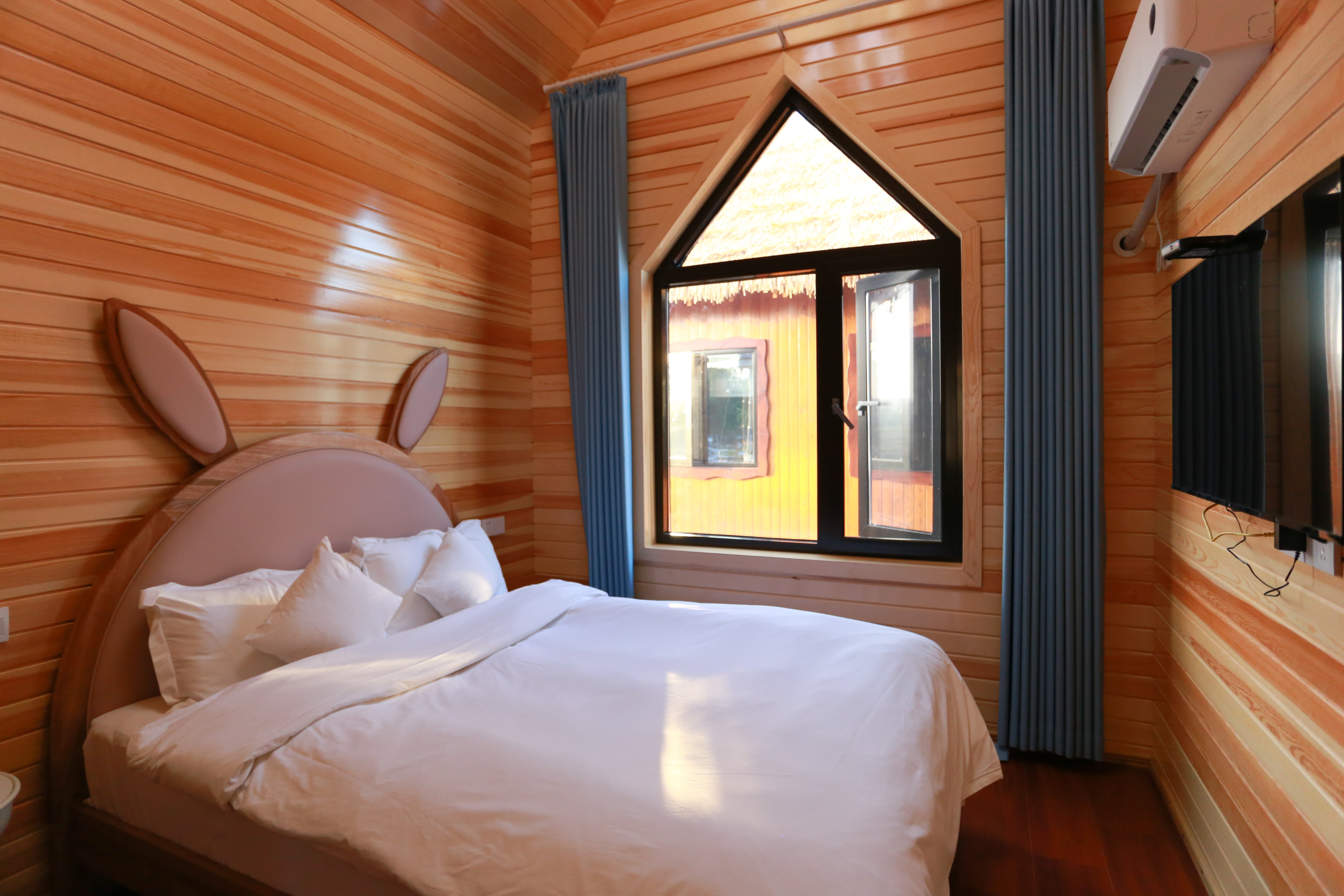 整个木屋别墅是两室一厅的布局,卧室也是采用的全木质装饰风格,非常有种住在小时候童话故事里城堡里面的感觉,推开门窗就是田野间,微风拂来透着些许花草的清香,似乎就差王子和公主了。