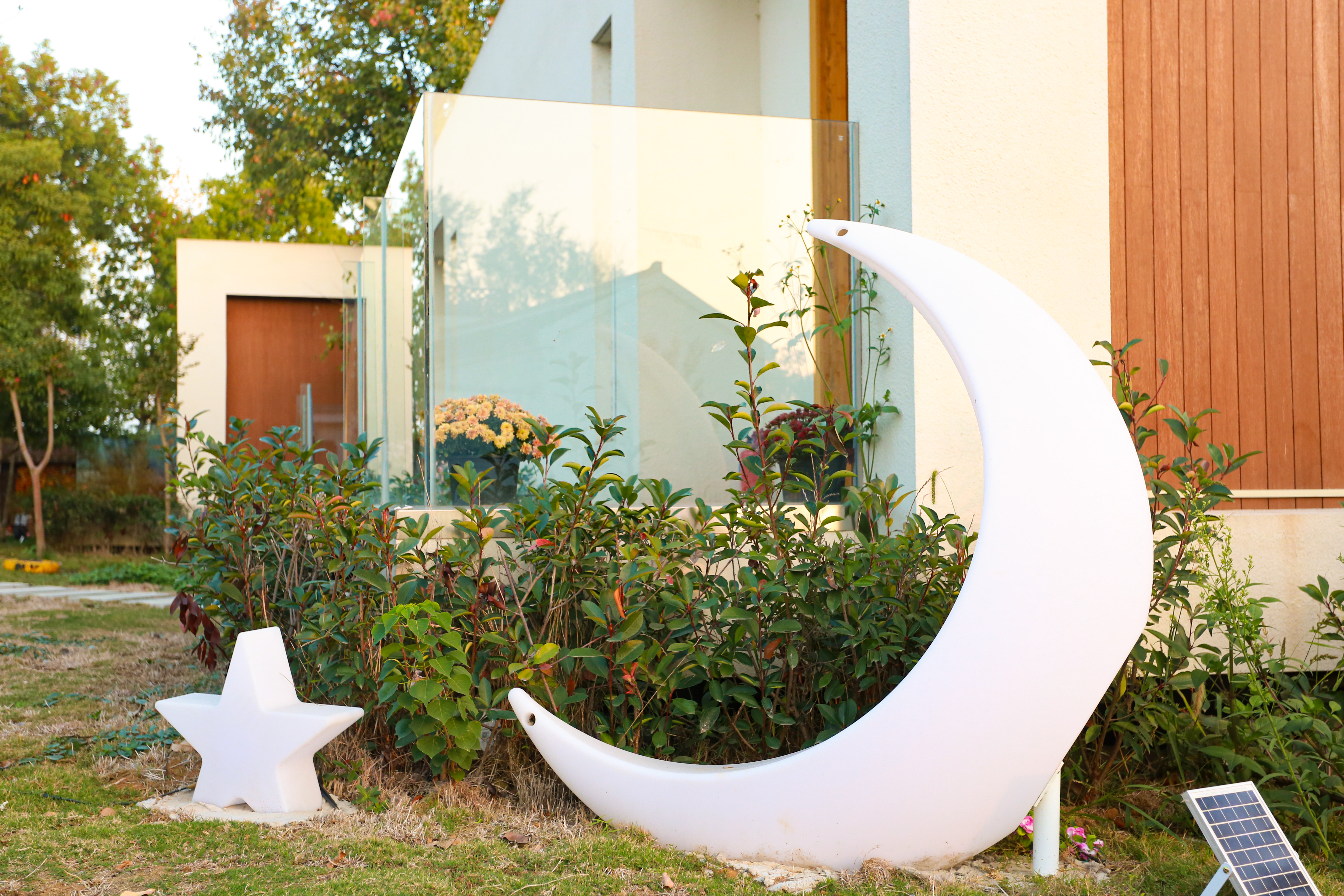傍晚我们开车抵达提前预定的位于大渔滩湿地公园旁的潘村民宿,网上很多推荐他们家的都说是 马鞍山 含山 县这边的最美乡村民宿。果然跟着导航抵达定位,从公路上要先穿过一座布满鲜花的网红吊桥才能走入民宿内部。