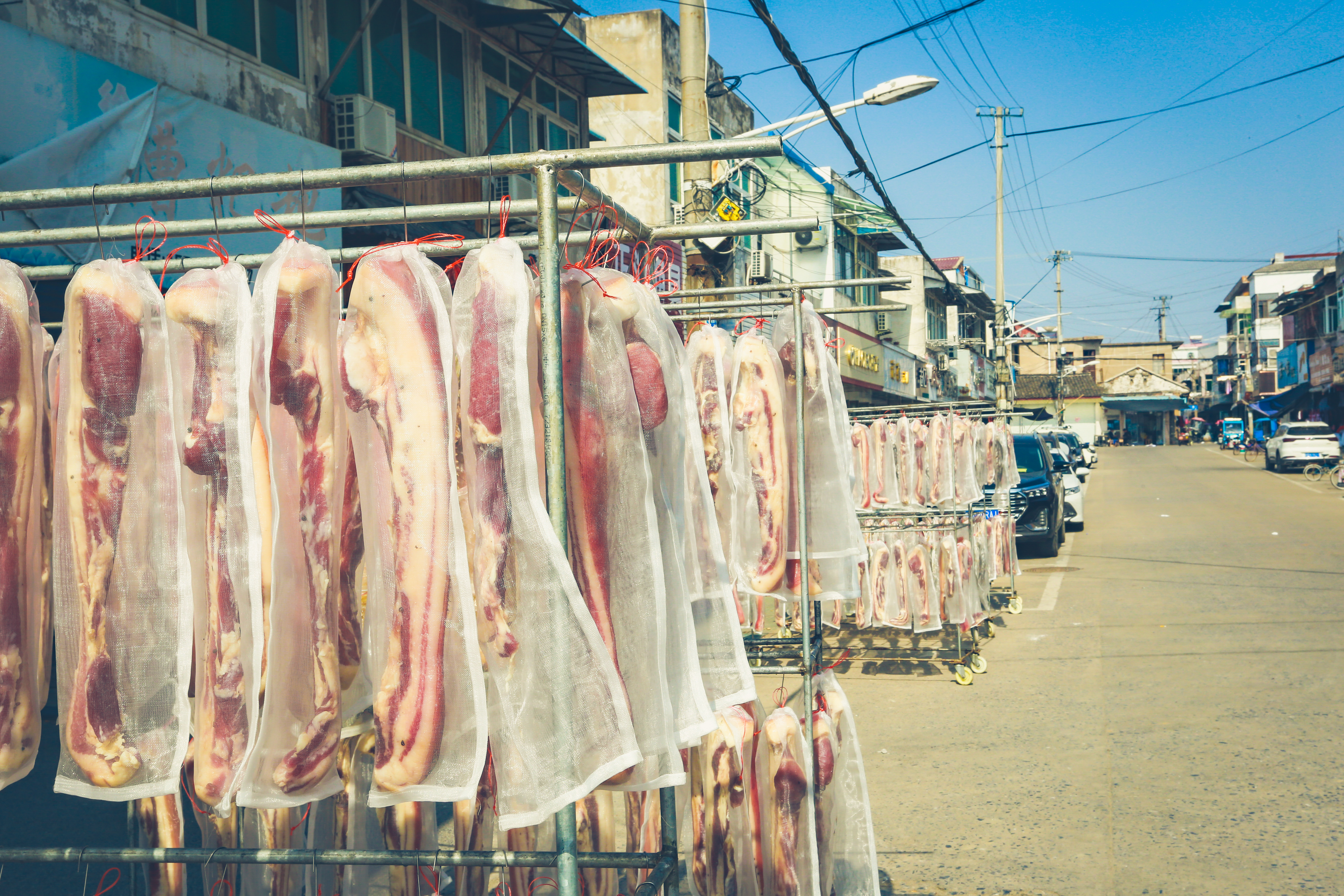 中午十分大概转了半个小时,其实古镇本来也不大,我们准备去觅食,老街上商业其实真不多,一路走来最吸引我的无疑是这满满一车的腊肉(也可能是风干肉),看得出这是一家餐馆自家做的,为的就是冬天的储备吧,瞬间我的脑海里浮现出香飘飘的腊肉火锅的场景,想到这里也不禁加快脚步,我的午餐也在等我了。