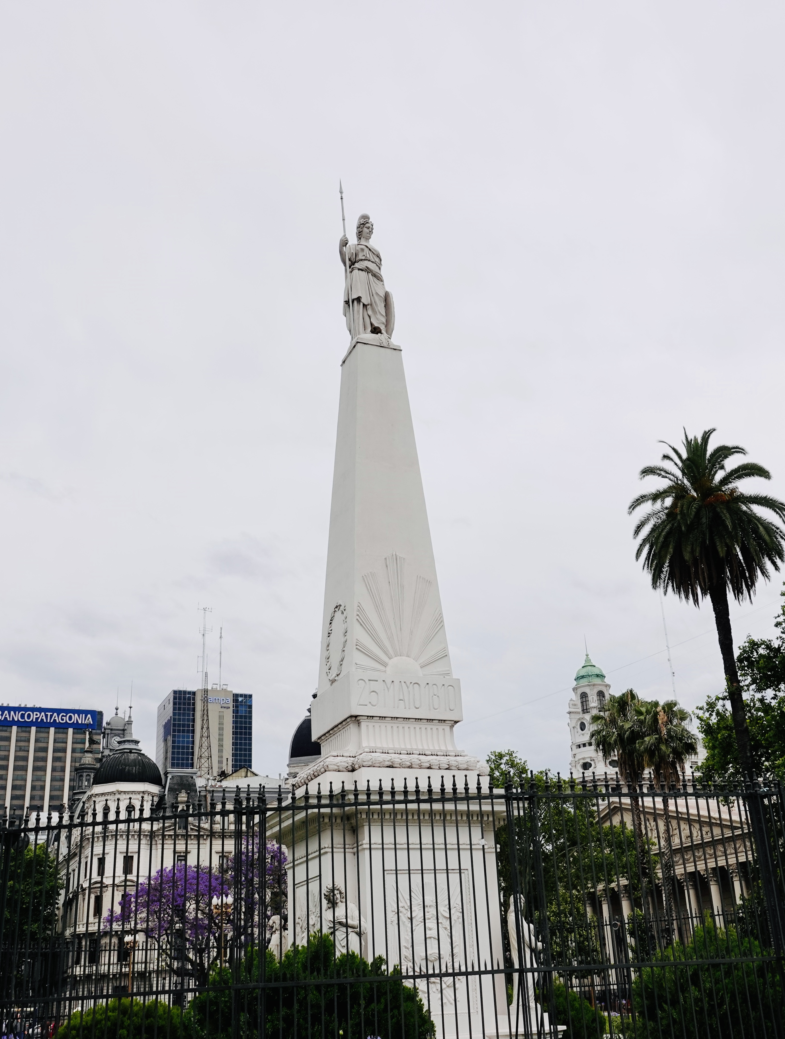 五月广场位于布宜诺斯艾利斯市中心,是当地人民举行重大活动的地方。五月广场以1810年5月25日爆发的五月革命命名,广场中心矗立着13 米高的金字塔尖型纪念碑,塔尖上有自由女神雕塑,是为纪念在1810 年五月革命中献身的爱国志士而修建的。以纪念碑为圆心,地上有一圈的白头巾母亲像,是为了纪念那些平凡而勇敢的母亲们,20世纪70年代在阿根廷军政府统治下,许多反政府人士遭到迫害或暗杀。为了寻找自己失踪的孩子,阿根廷的母亲们组织起来,头戴白色头巾,每逢周四就在五月广场上围成一圈敲锅行走,以这种方式引起阿根廷民众和国际社会的关注。