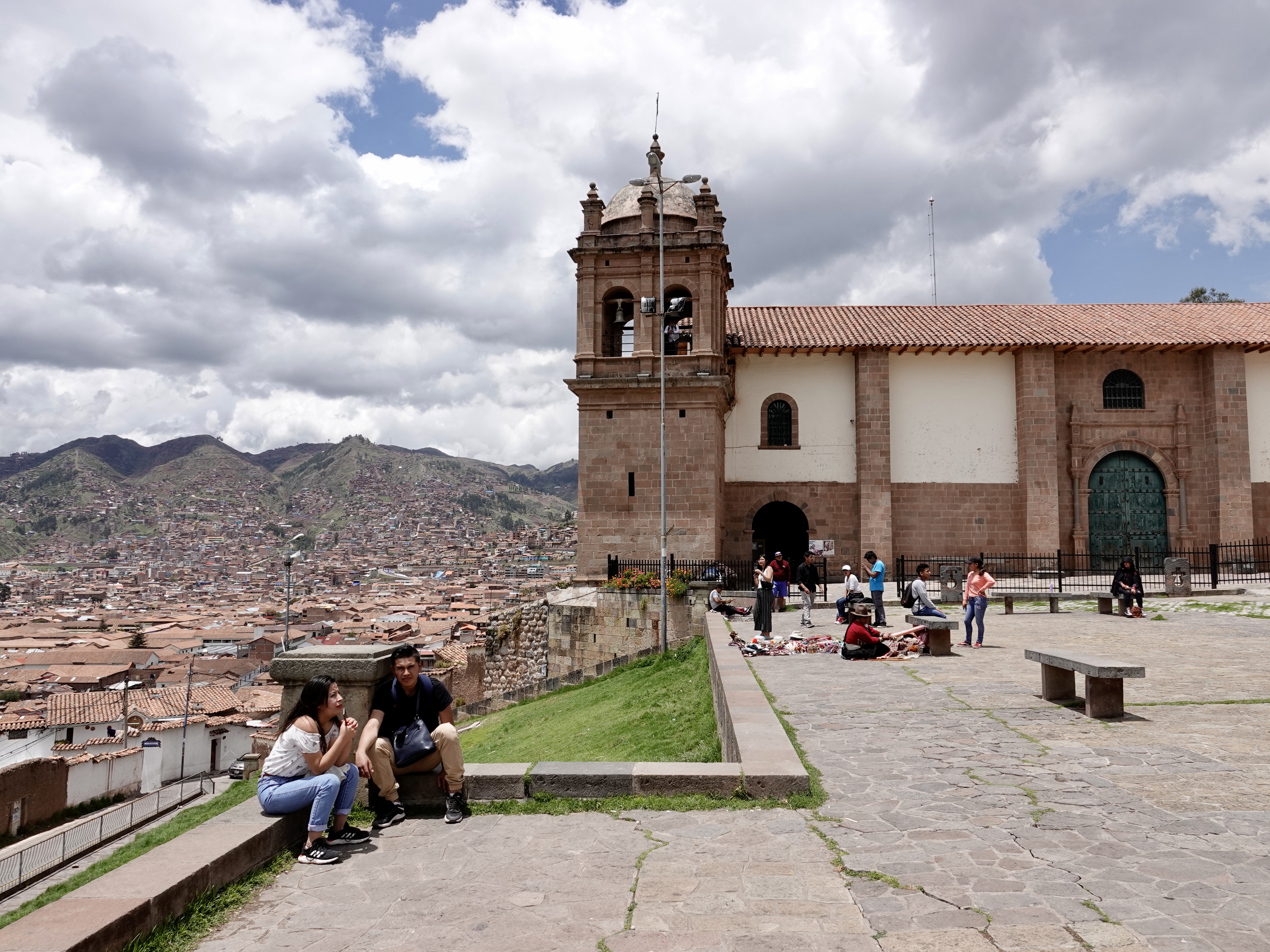 广场北侧的库斯科大教堂始建于1560年,位于印加神庙的遗址上,前后花费了100年才建成。这座教堂融会了文艺复兴风格和巴洛克风格,其顶端的福音钟楼上悬挂着一口重达130吨的巨钟,据说它是南美大陆最大的钟,钟声能传到40千米之外。库斯科大教堂的亮点是那幅“最后的晚餐”,画家做了本土化的特色修改,餐桌上盘子里是一只烤豚鼠,烤豚鼠是当地的一种特色美食。教堂内不让拍照。 库斯科大教堂左右两边分别是耶稣玛丽亚教堂和艾尔·特诺夫教堂,广场东侧则是耶稣会教堂。