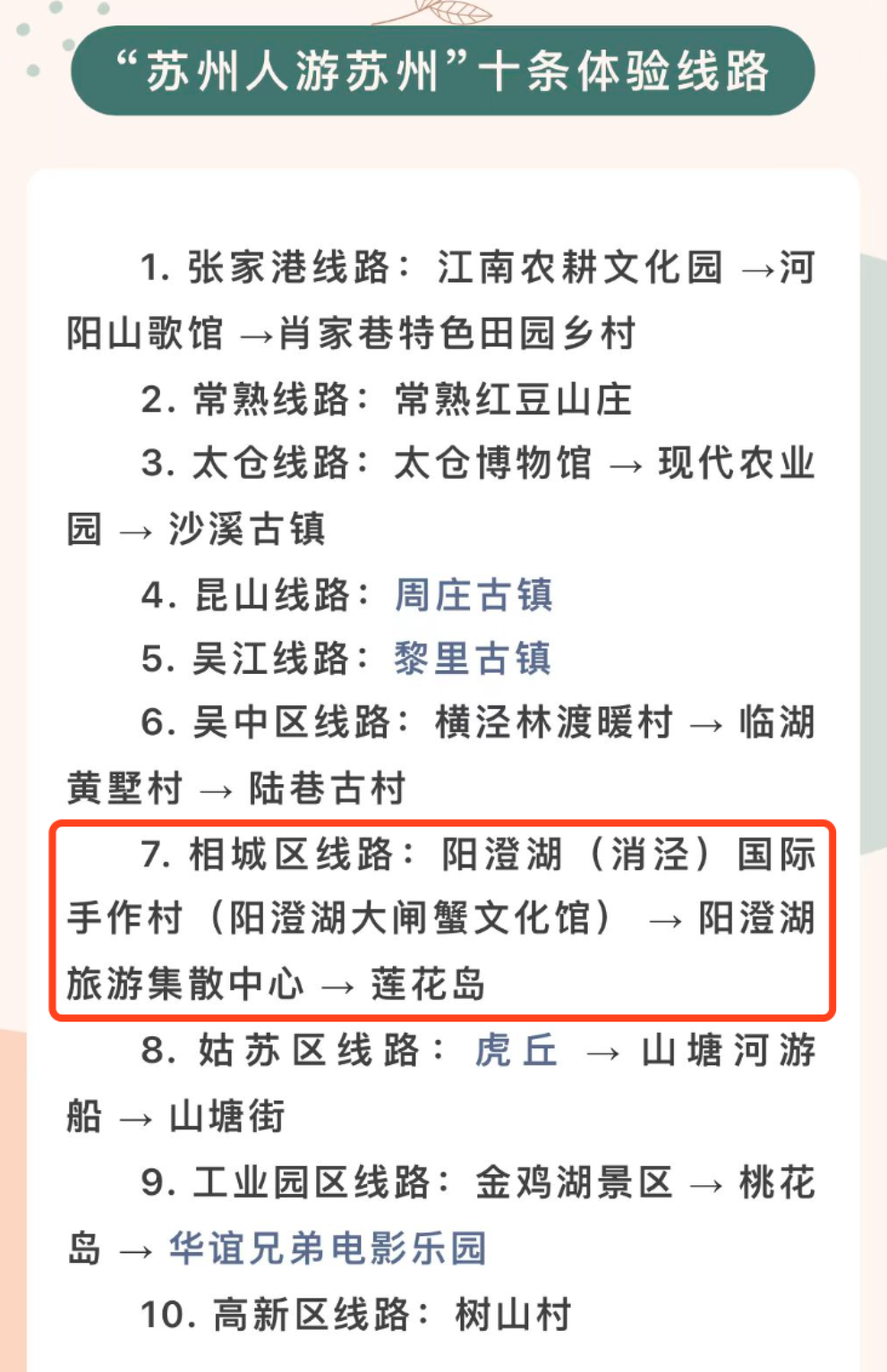 相城区线路:阳澄湖(消泾)国际手作村(阳澄湖大闸蟹文化馆) → 阳澄湖旅游集散中心 → 莲花岛