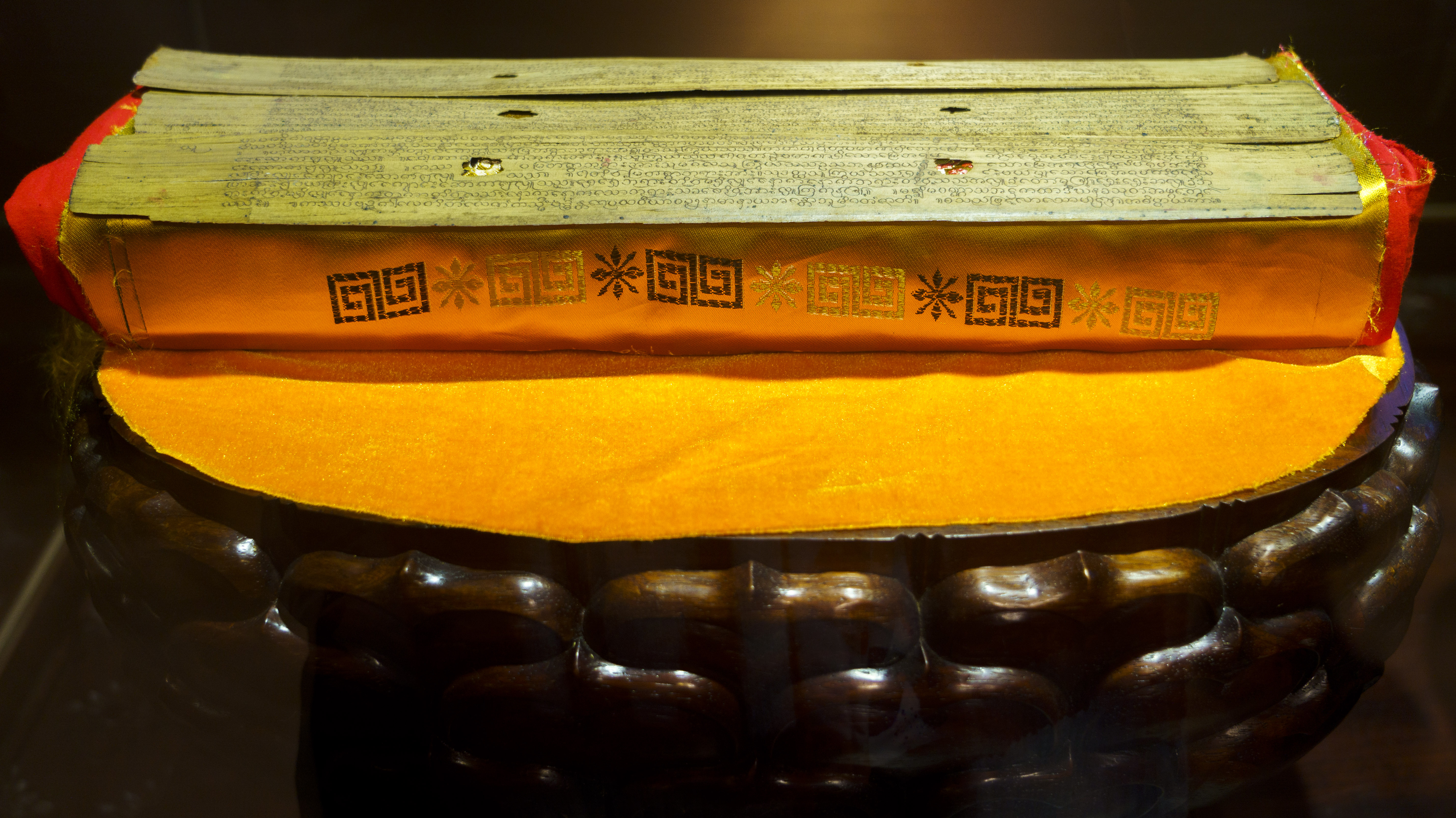 第二个宝贝叫做【贝叶经】,它是用泥金书写梵文《华严经》于贝多罗树叶上,别看图中看着不是很大,实际上却达到了惊人的246页,因树叶比较薄,所以卷起来之后并不大,能够保存这么多年也是极其的不容易,让人惊叹。