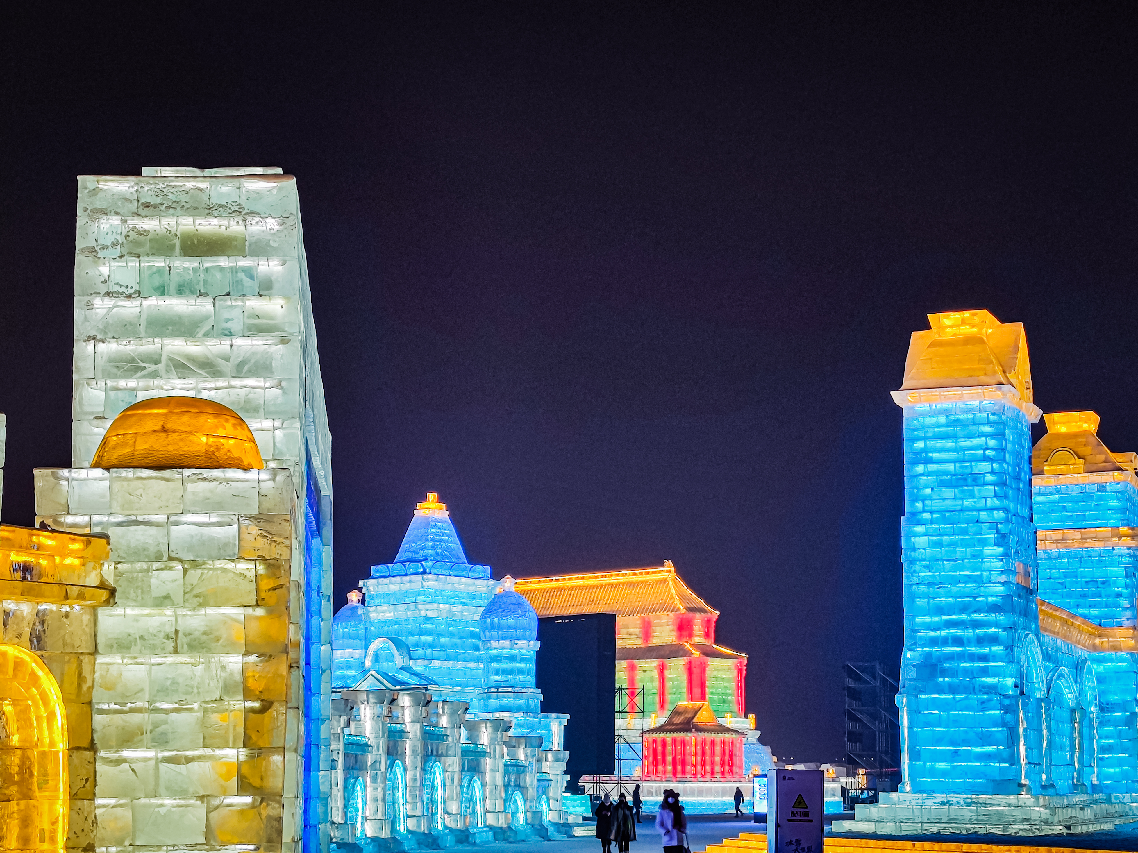 夜晚,灯光亮起之后,与五花十色的各种冰雕合影吧