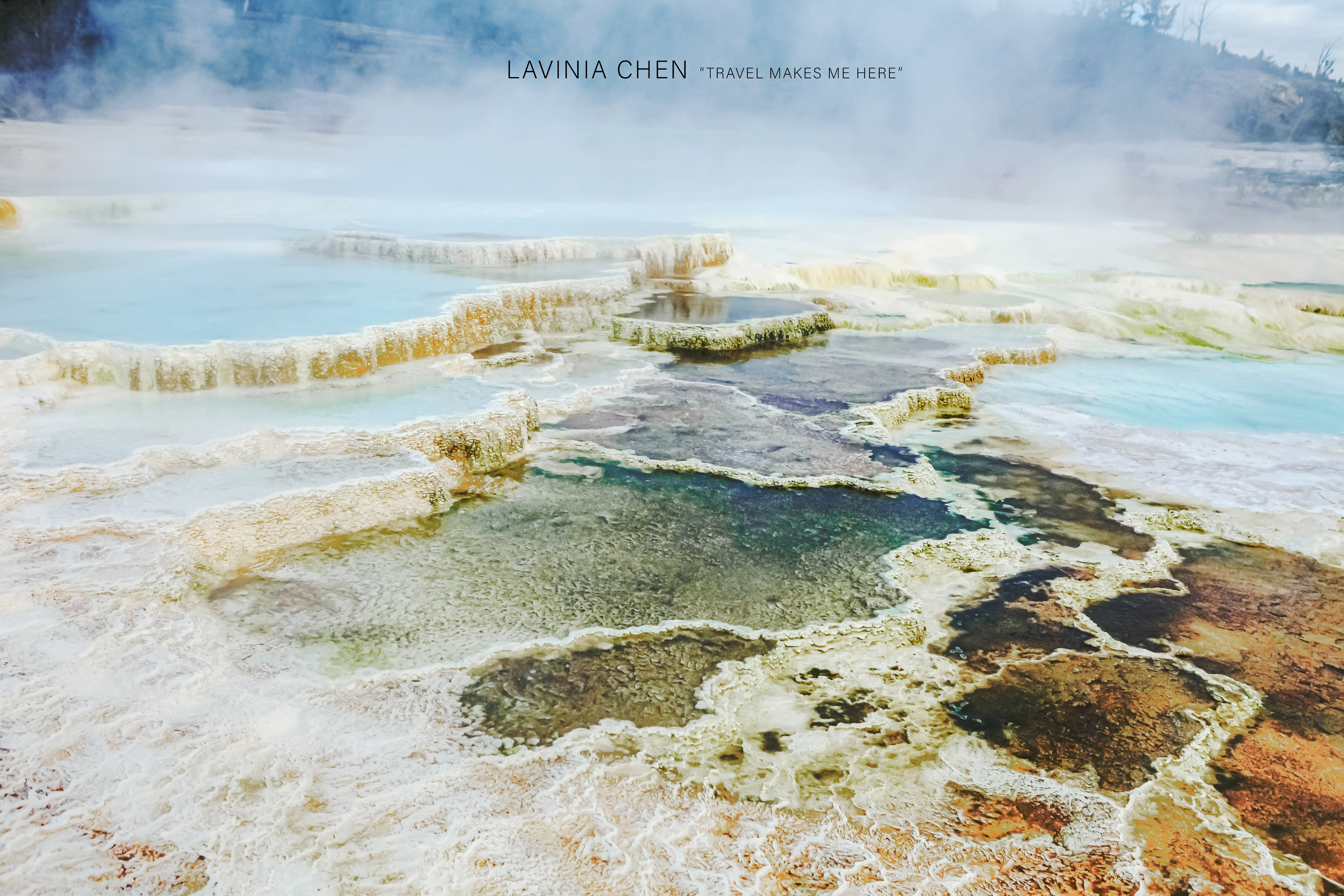 在超级火山黄石破火山口徒步探险,穿梭于世界末日般水雾缭绕的石灰石台阶和地热沸泉中。