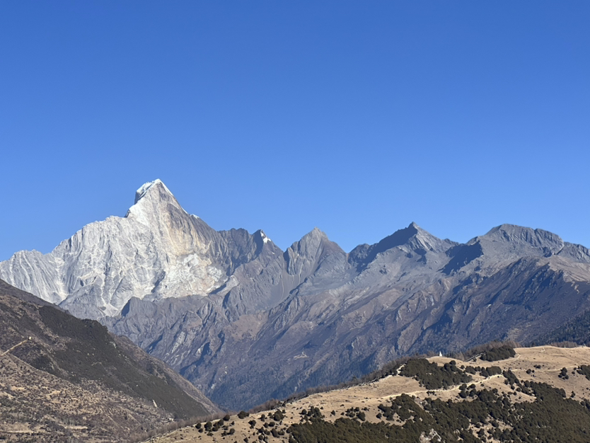 经过猫鼻梁观景台,我们在此停留了片刻,欣赏了四姑娘山的全貌,四座雪山虽然没有雪,却依旧挺拔,猫鼻梁也是一个看日落金山的观景台,但是因下午的行程是去双桥沟,于是我们拍照打卡后就离开了。