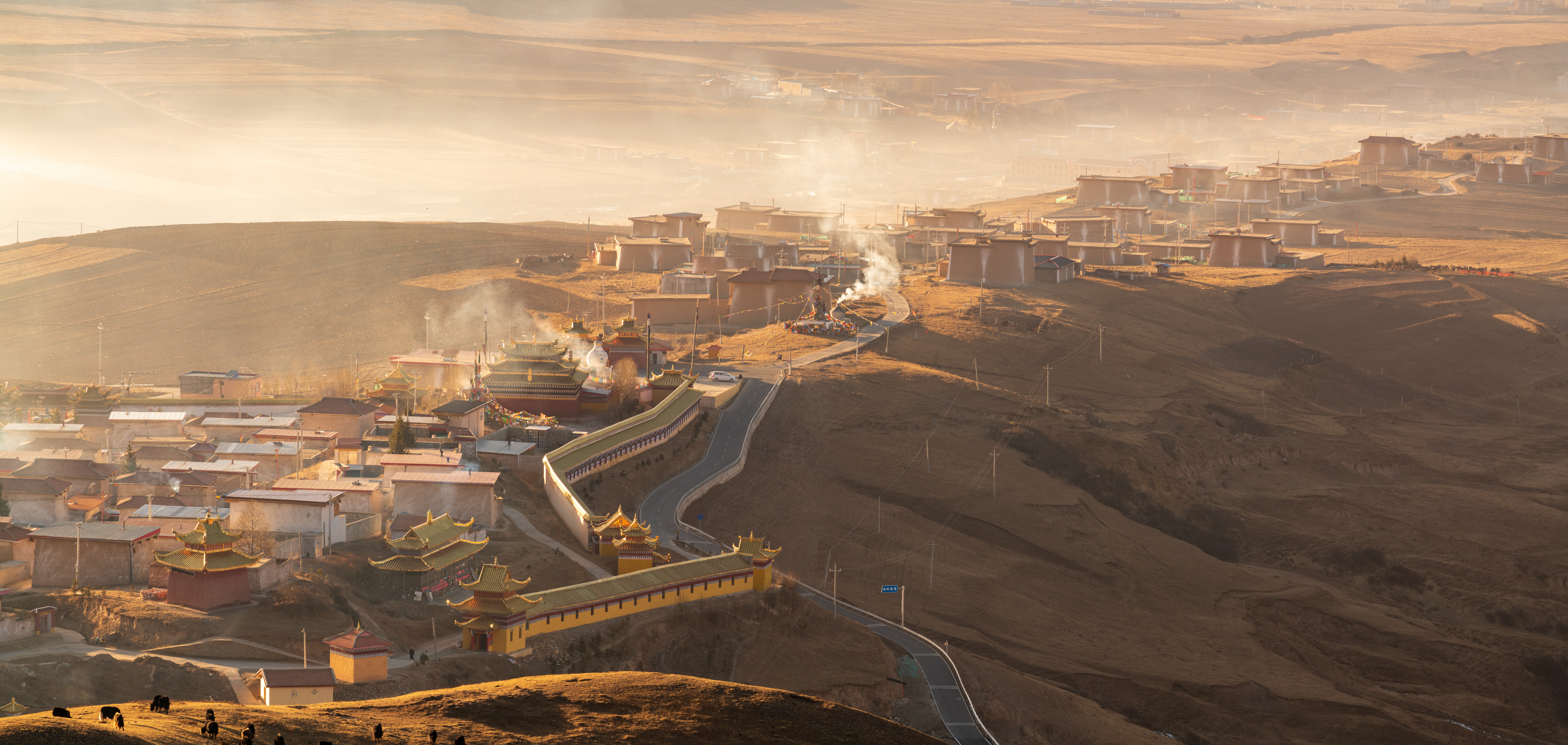 桑烟升腾,晨雾弥漫,在逆光中让为整个视野成为一片金黄。朗依寺则在这片飘飘渺渺的黄金帷幔中若隐若现。