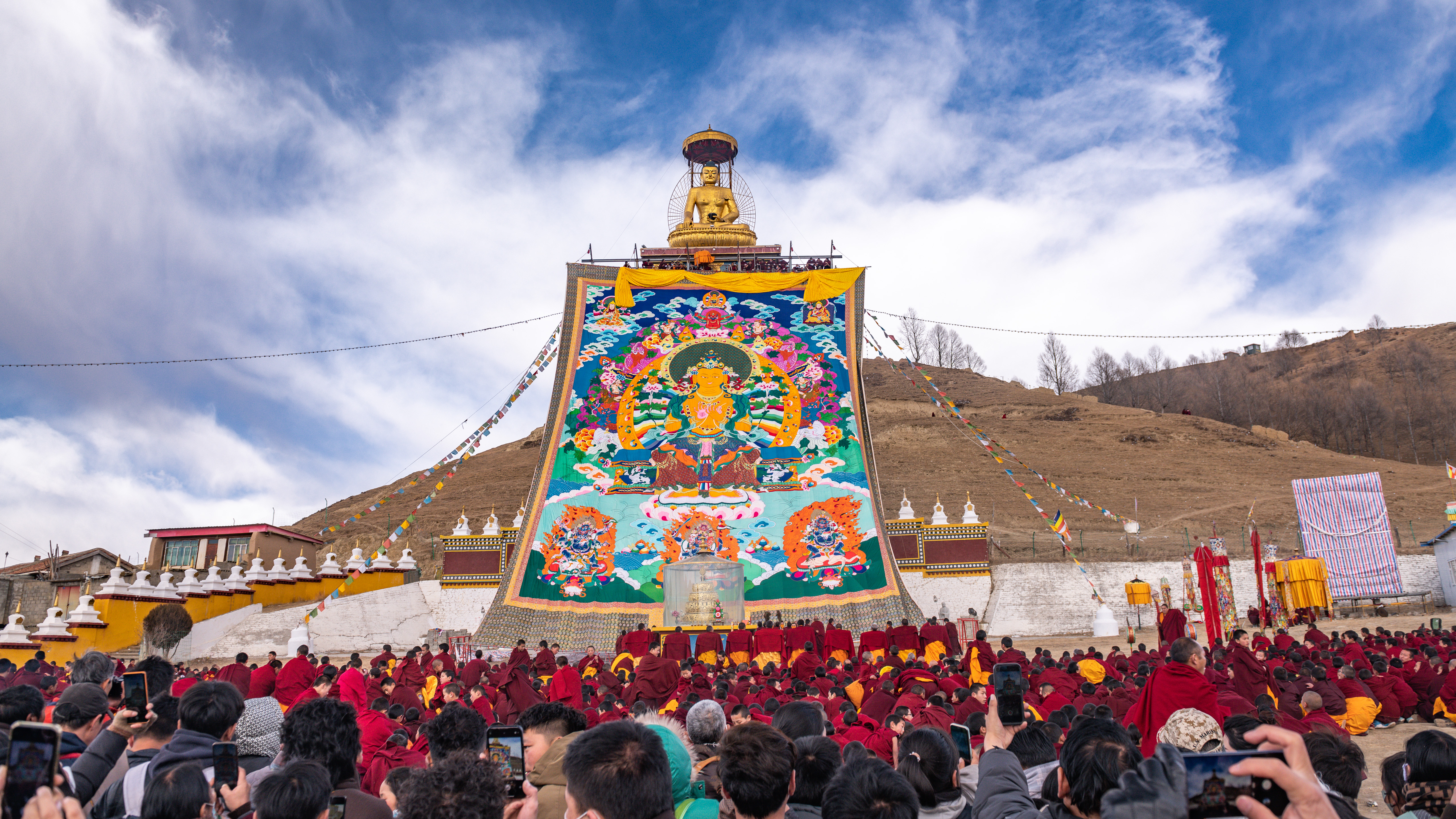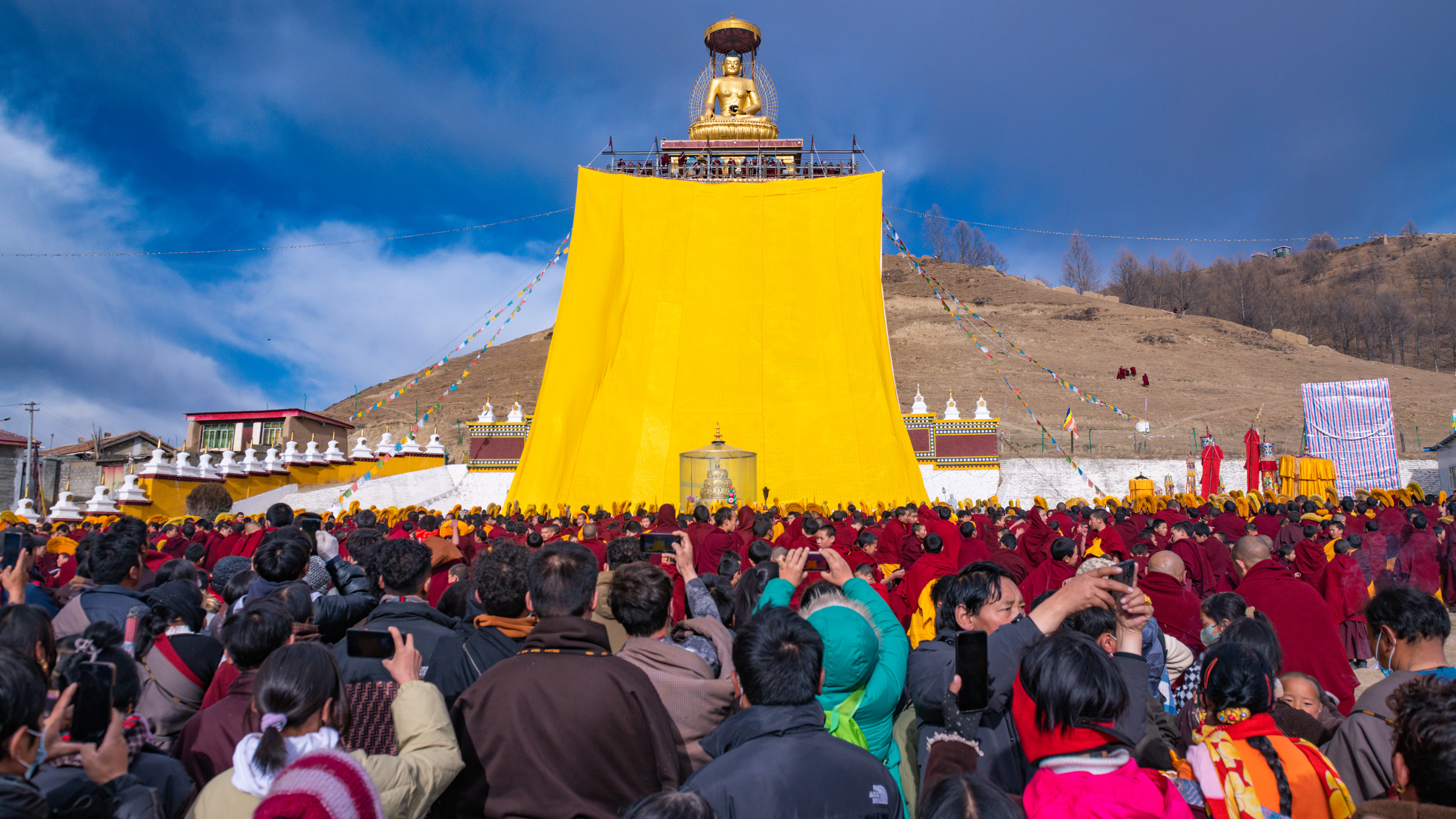 朝霞中,僧人们完成了诵经仪式,将常年供奉于寺庙中巨大的弥勒佛唐卡画卷抬出大殿,信众和游客瞬间拥了上去,在佛像周围围出了一条长长的人墙,僧人抬着唐卡,如同一条绛红色的长龙,在人群中蜿蜒。