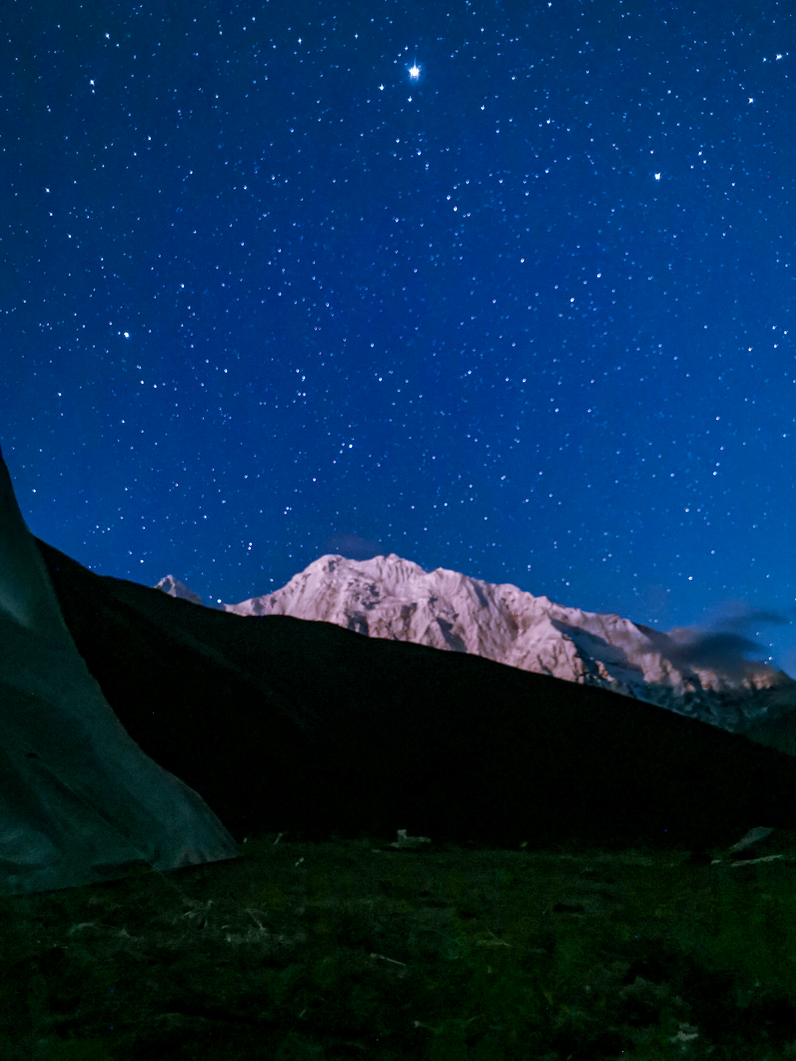 所谓上山容易下山难,接下来,我们要从海拔5200的地方下降到4100的地方。六点多已经天黑昏暗,七点已经全黑,我们一行打着头灯,摸索着,小心翼翼地,在漫天星河下,从滑坡上滑下来。走一步滑几步,虽然跟下午的爬坡比起来轻松些,但是下坡显然也不是什么容易的事情,毕竟还背着一个沉重的背包,这对腿部,脚部,膝盖的伤害都是极大的。