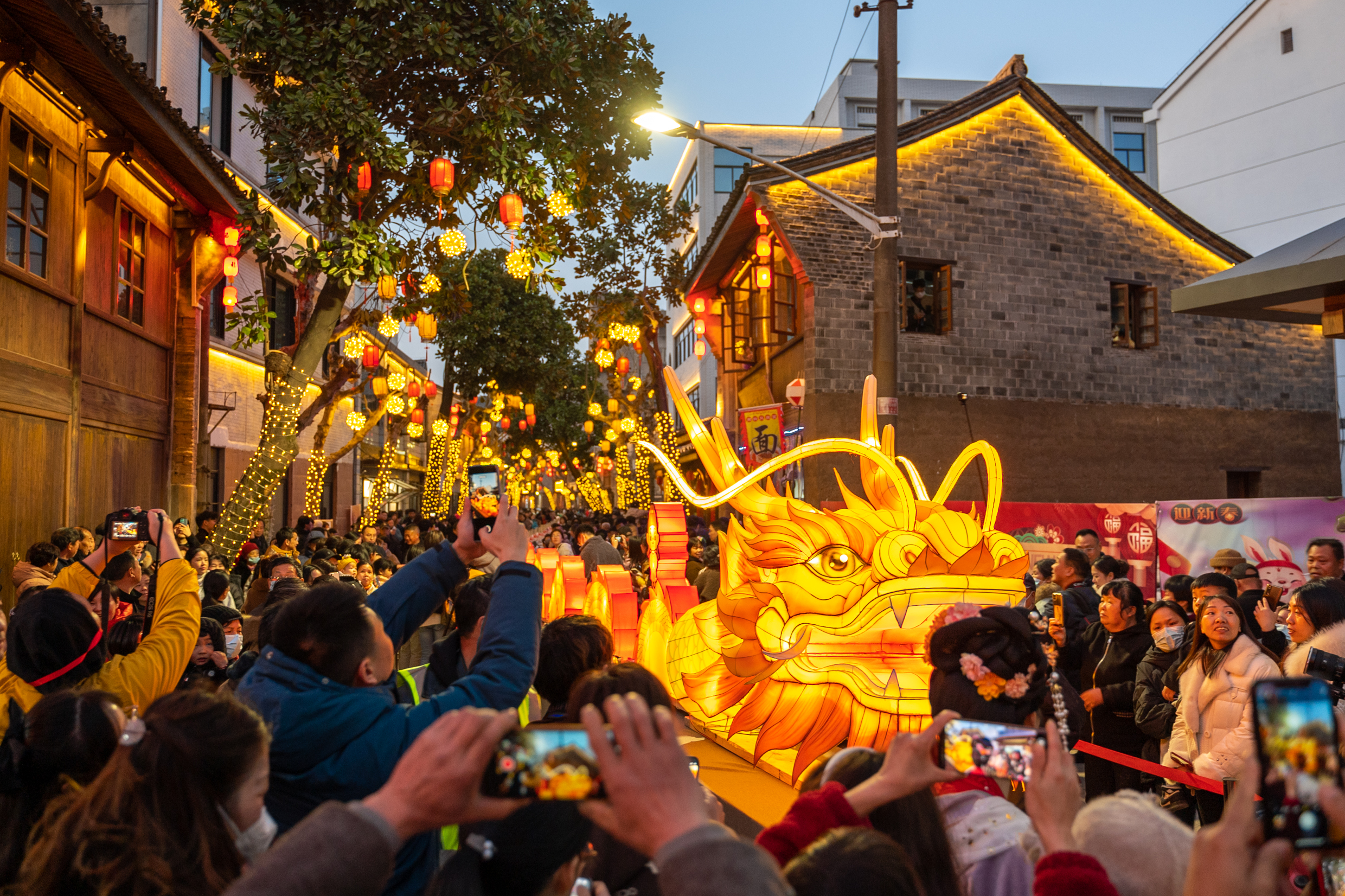 随着舞龙队伍来到南街,熙熙攘攘的人群好不热闹,街中间长百余米的长桌宴待点亮“龙头”、“龙身”,一道道当地特色美食端了上来,豆浆、春饼、炒年糕、芋饺……真的是许久没有感受过这般热闹的氛围了,满满的温暖。