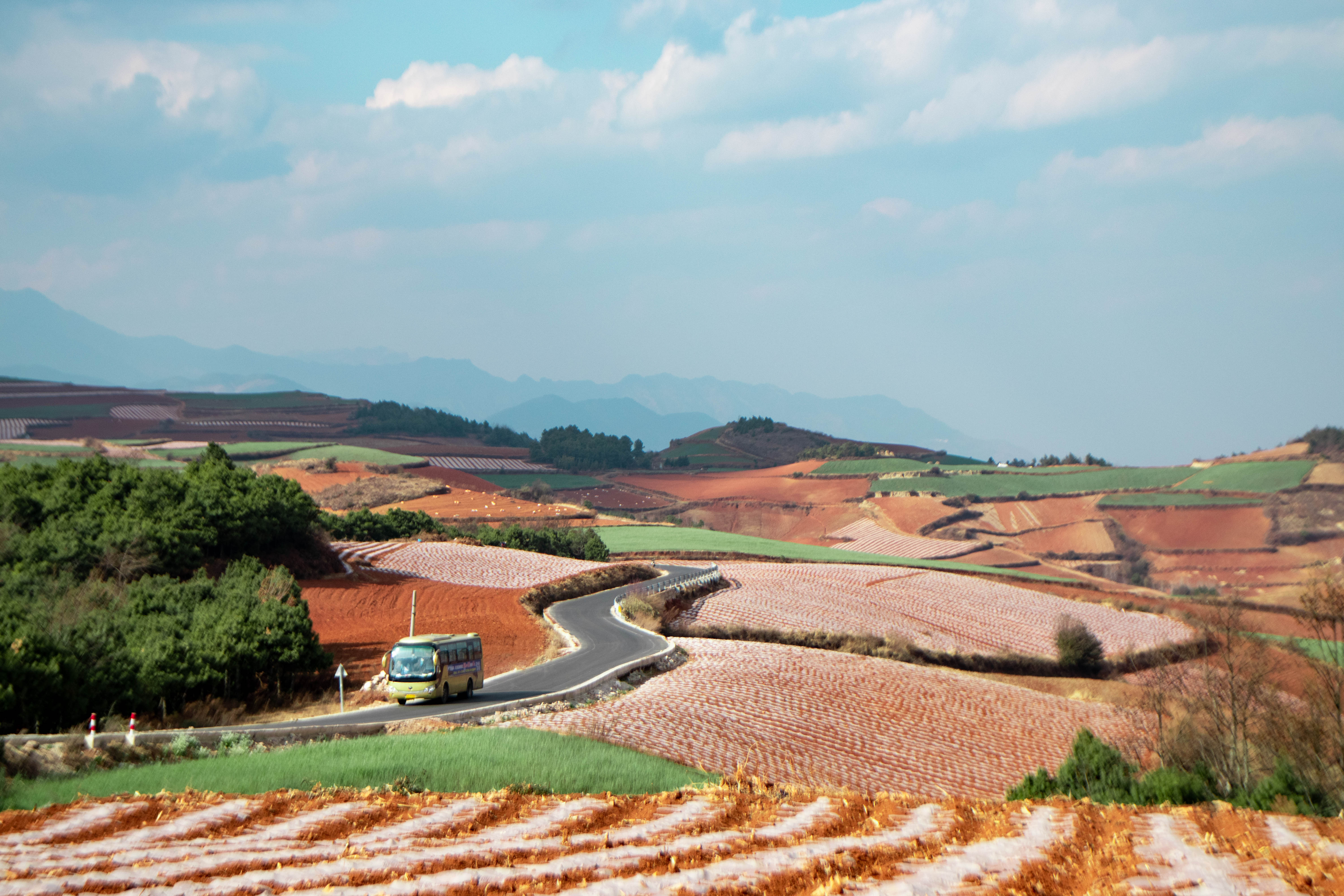 即便是在梦里,我也从未想象过同一个山坡可以有这么丰富的色彩。红、橙、黄、绿还有上面的蓝天白云,描绘出一负童话般的田园油画。太阳时而藏在云层后,时而慷慨地露面,一挥手将阳光洒向大地。在这不均匀的光斑下,红土地显得格外俏皮,绿而不油的麦子诉说着春的消息,远处的风车则与风纠缠着低语,一切的一切美的让人叹息。