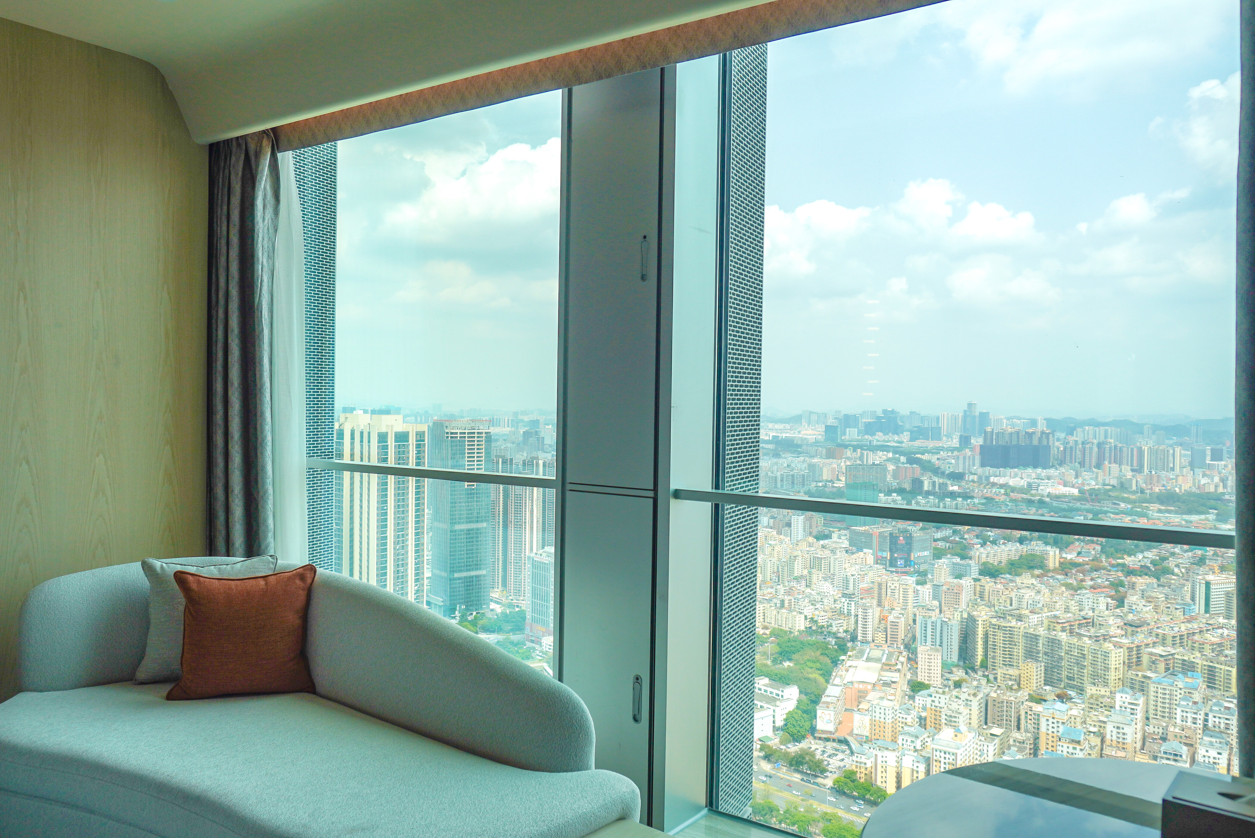 我们入住在53层的双床房,时尚简约的设计风格,色调温和雅致,给人耳目一新的时尚感。房间拥有大片落地窗,躺在靠窗的沙发上,看云卷云舒,眺望深圳这座繁华之城。