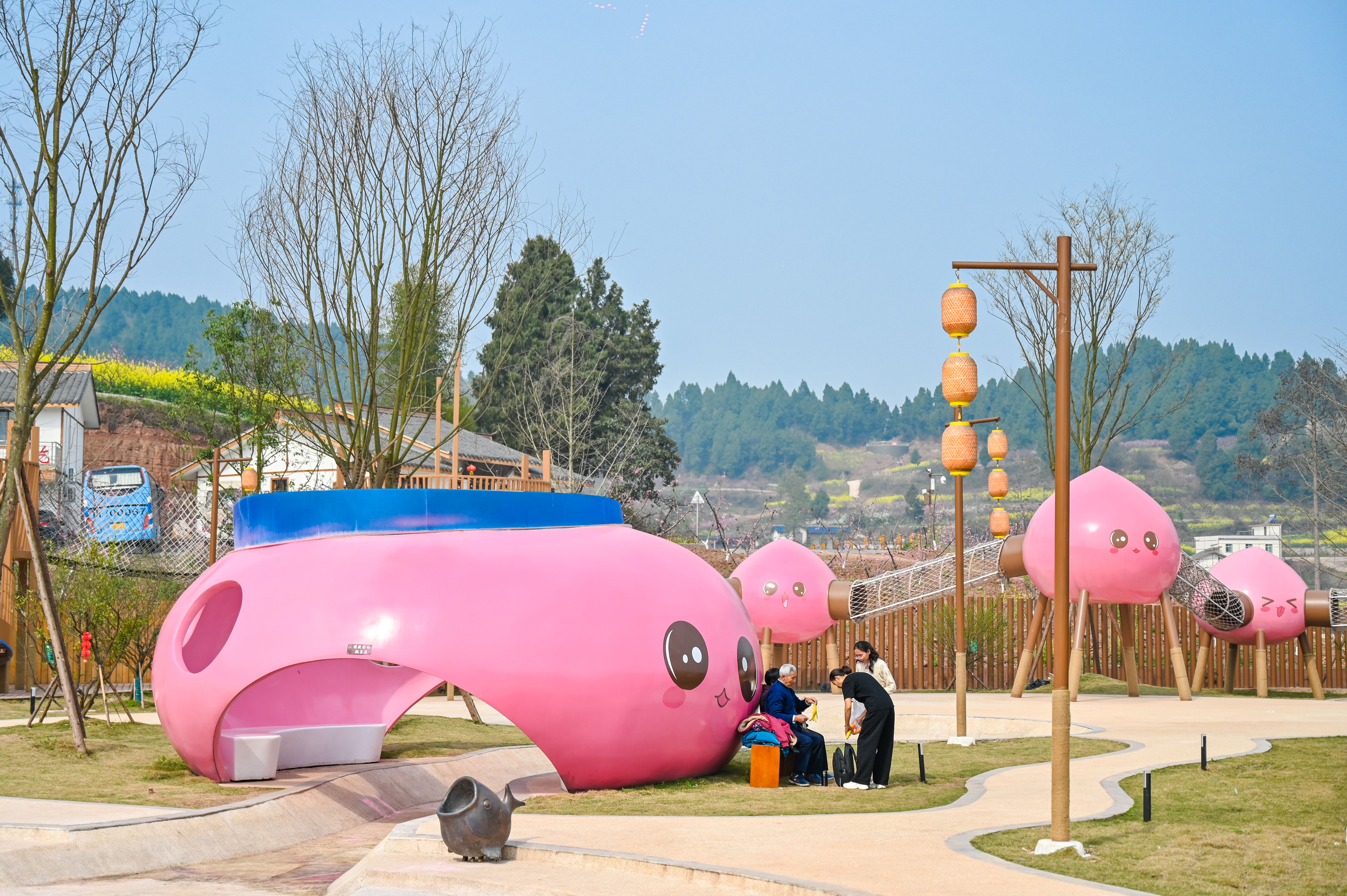 宋村景观湖旁还有一个小桃气乐园,是以桃文化为主题的儿童乐园,里面可以玩水、沙坑、攀爬、树屋、滑梯等多种项目,粉粉嫩嫩的,让我这个大朋友也很喜欢呢!
