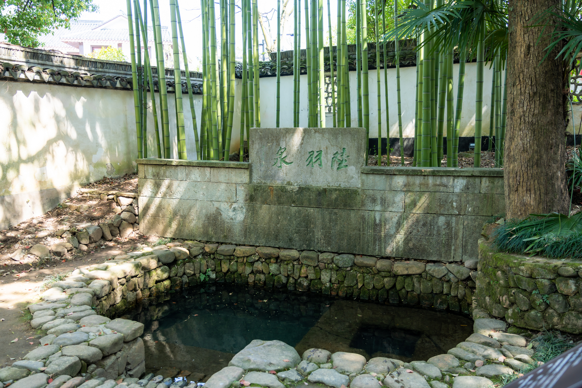 陆羽泉已有 1200 多年历史,有参天古樟依伴,泉分两口,一大一小,大井中水用于洗滁,小井中水用于泡茶。泉旁青石上锩刻由当代书法泰斗沙孟海先生书写的“陆羽泉”三字。